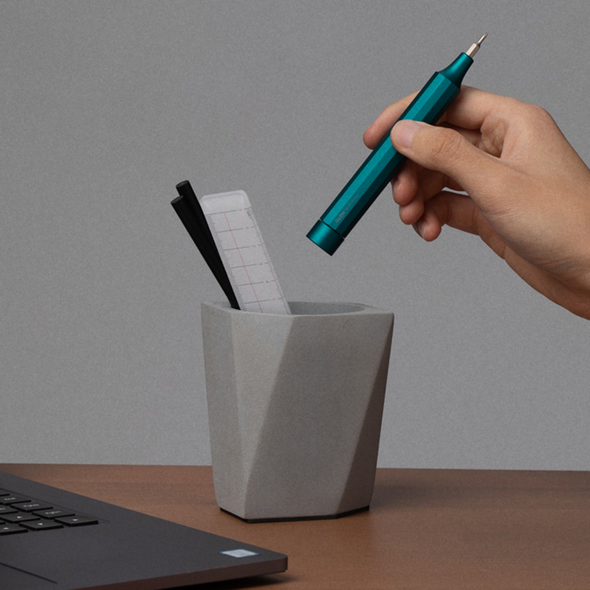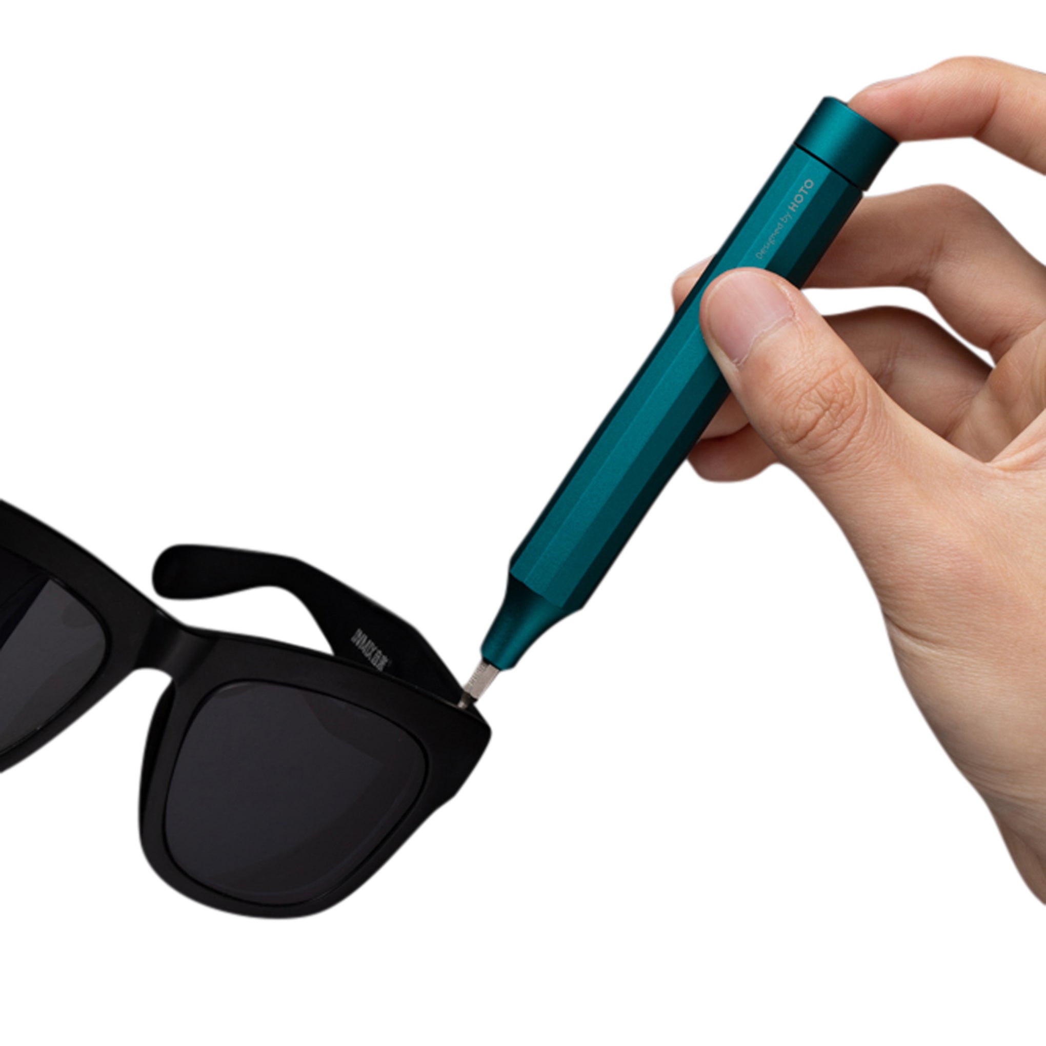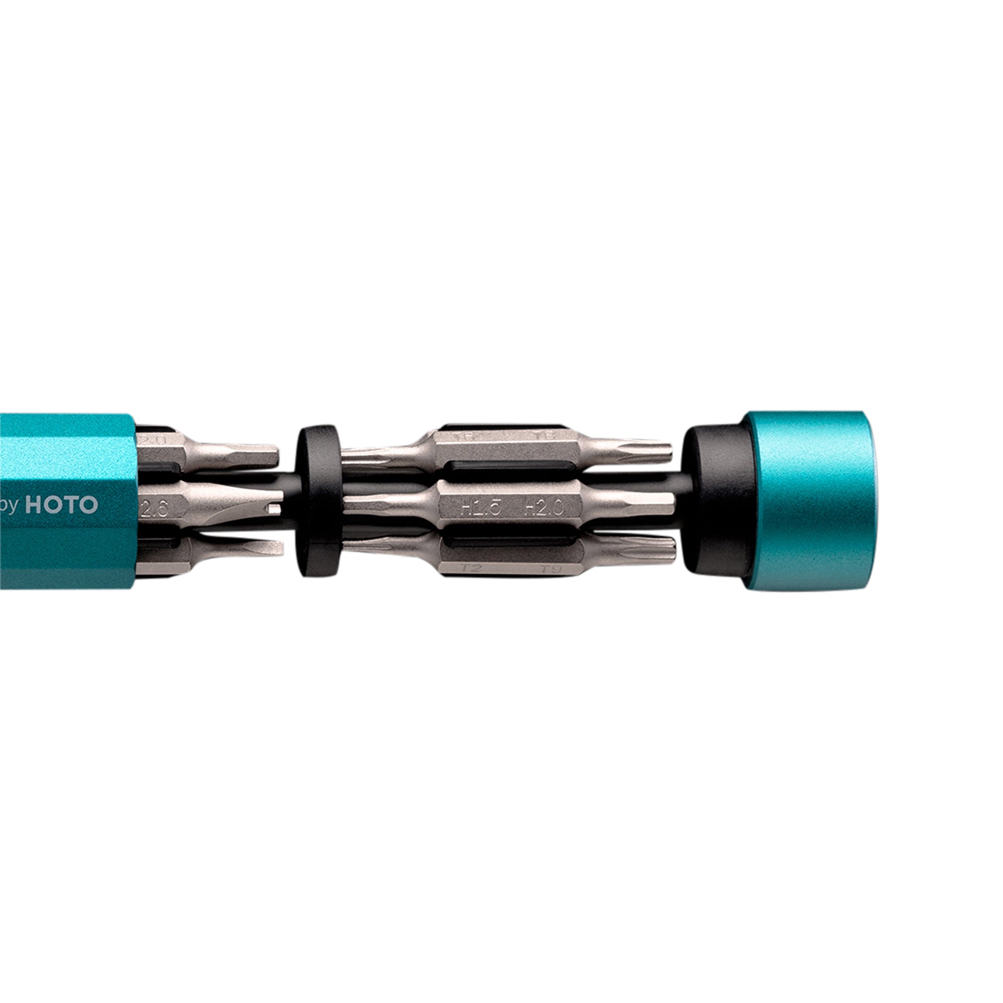 As compact and easily maneuvered as a pen. this tiny screwdriver from Hoto has a magnetic chuck and an unique all-in-one design: It stores 24 S2 alloy steel bits inside its brightly colored. aluminum alloy body??each easily removed or replaced with a simple click. Ideal for precision jobs like eyeglass or watch repair. The screwdriver itself measures 4.75h x 0.65 diam.