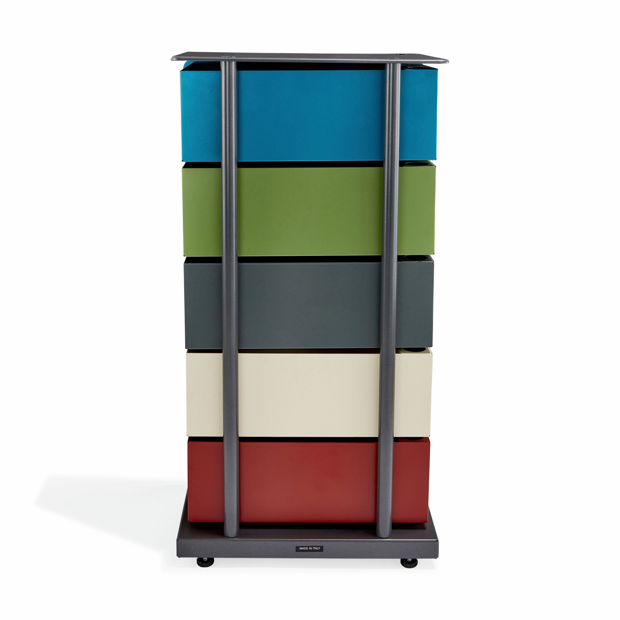 MoMA Exclusive: A beautiful. space-saving solution to your storage needs. the five drawers of this multicolor cabinet pivot out completely. fully exposing the items within it. Made in Italy of powder-coated steel. the 5-Drawer Pivot Cabinet can be used to store and organize many types of household items: notebooks. toys. makeup. electronics. office supplies. files. tax records and other important documents. art supplies and more. Measuring 28.5h x 15w x 10.5d. with a 4.5h x 11.8w x 8.7d interior. the Pivot Cabinet can also be used as a bedside table. Weighs 28.6 lbs.