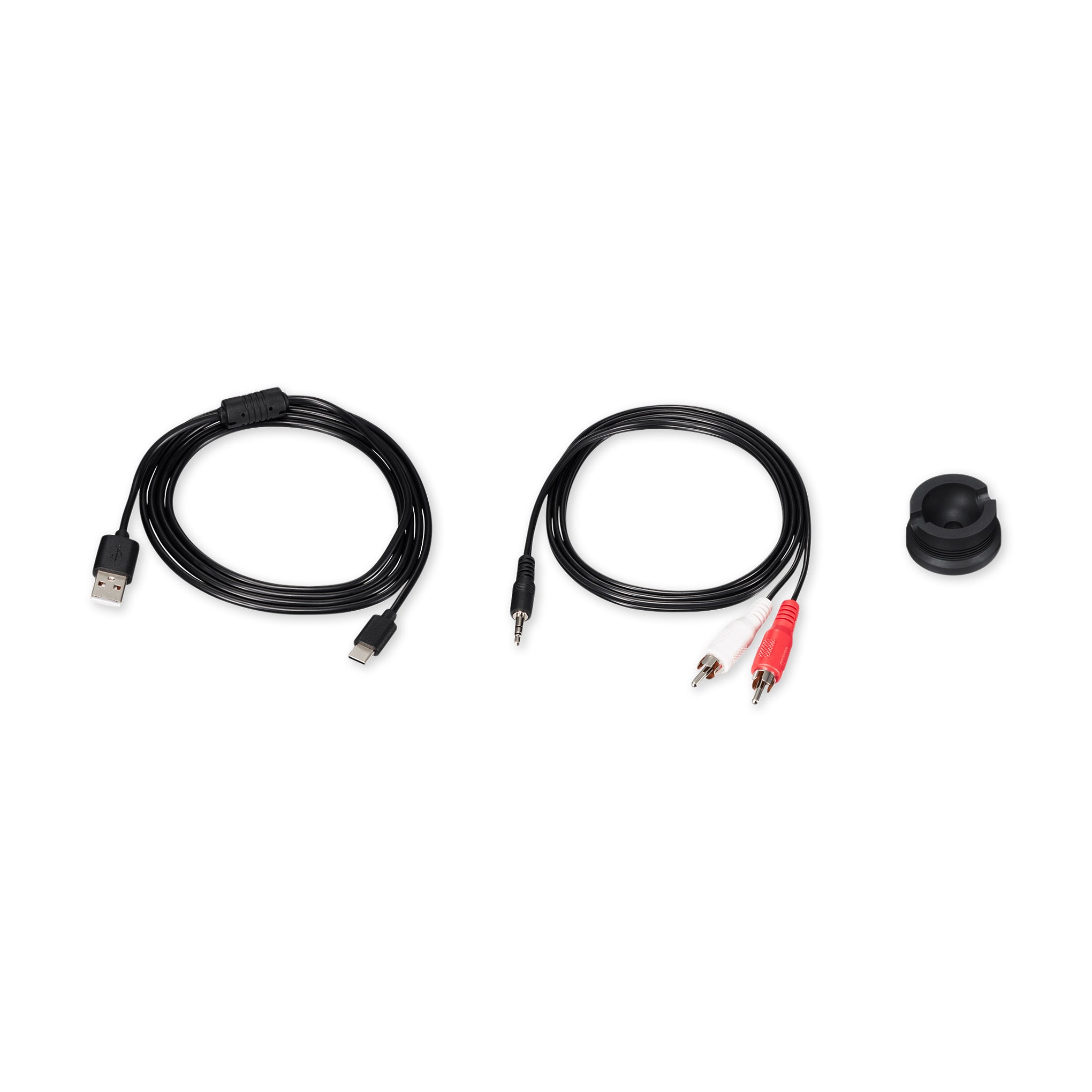 • Accessories include 45 RPM adapter. 3.5mm male to dual RCA male audio cable. USB-A to USB-C charging cable (power adapter not included)