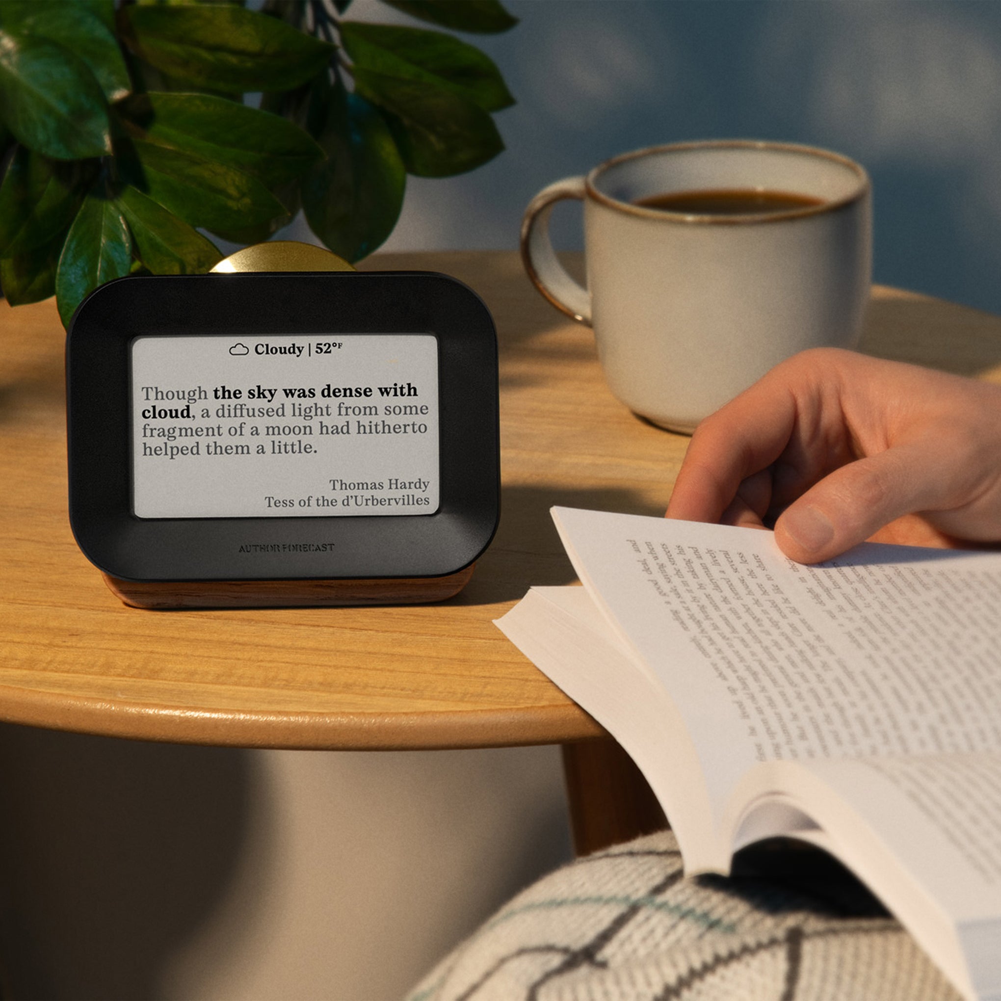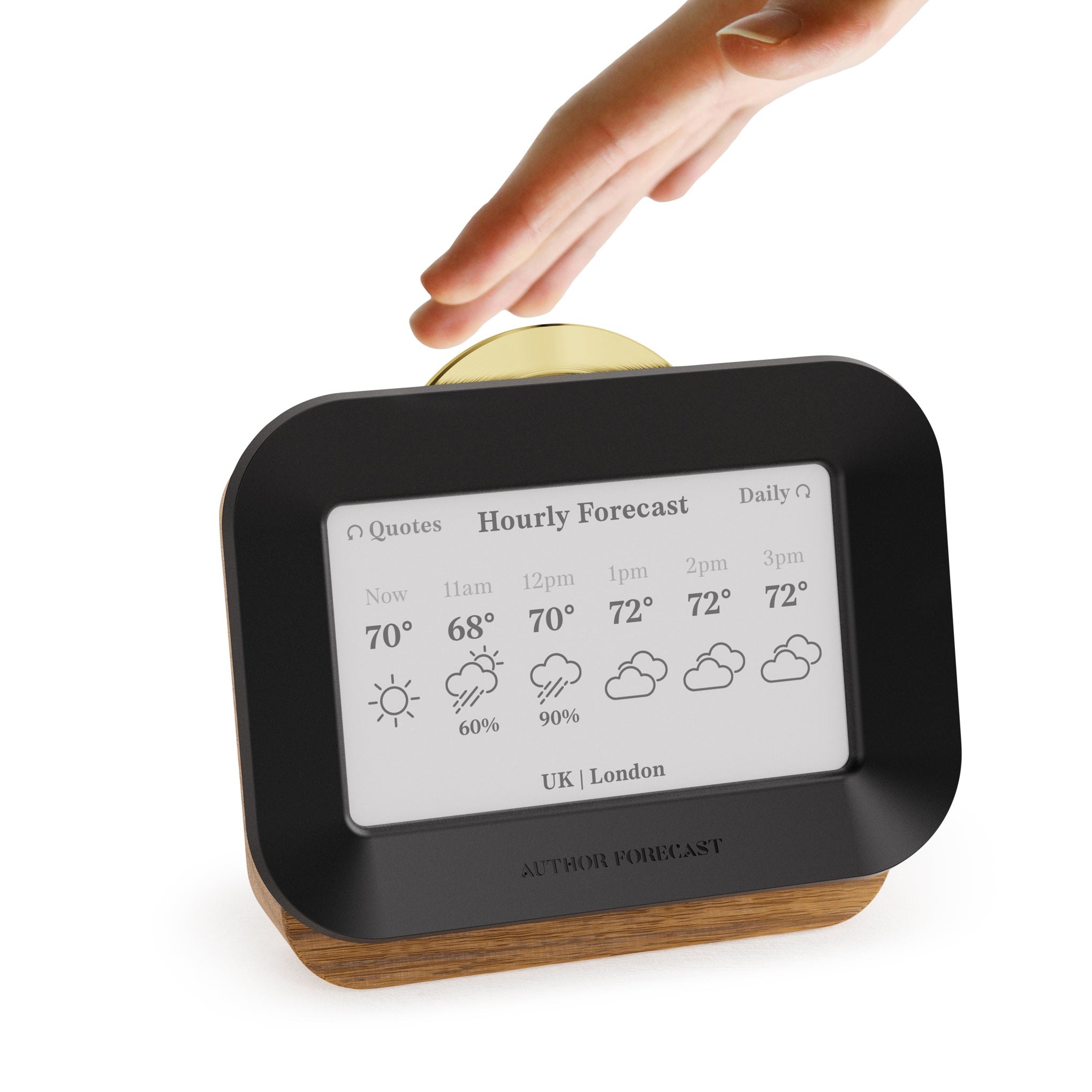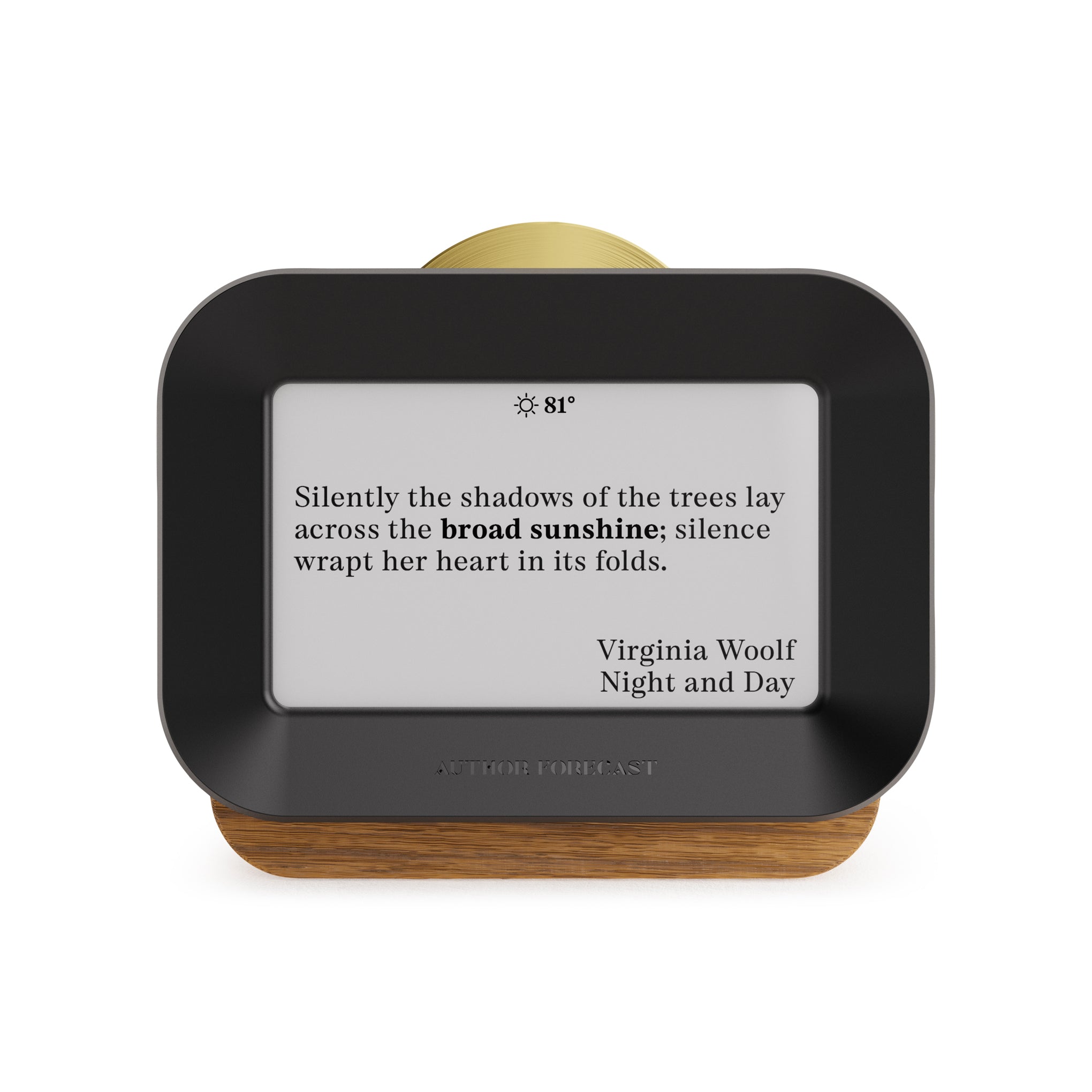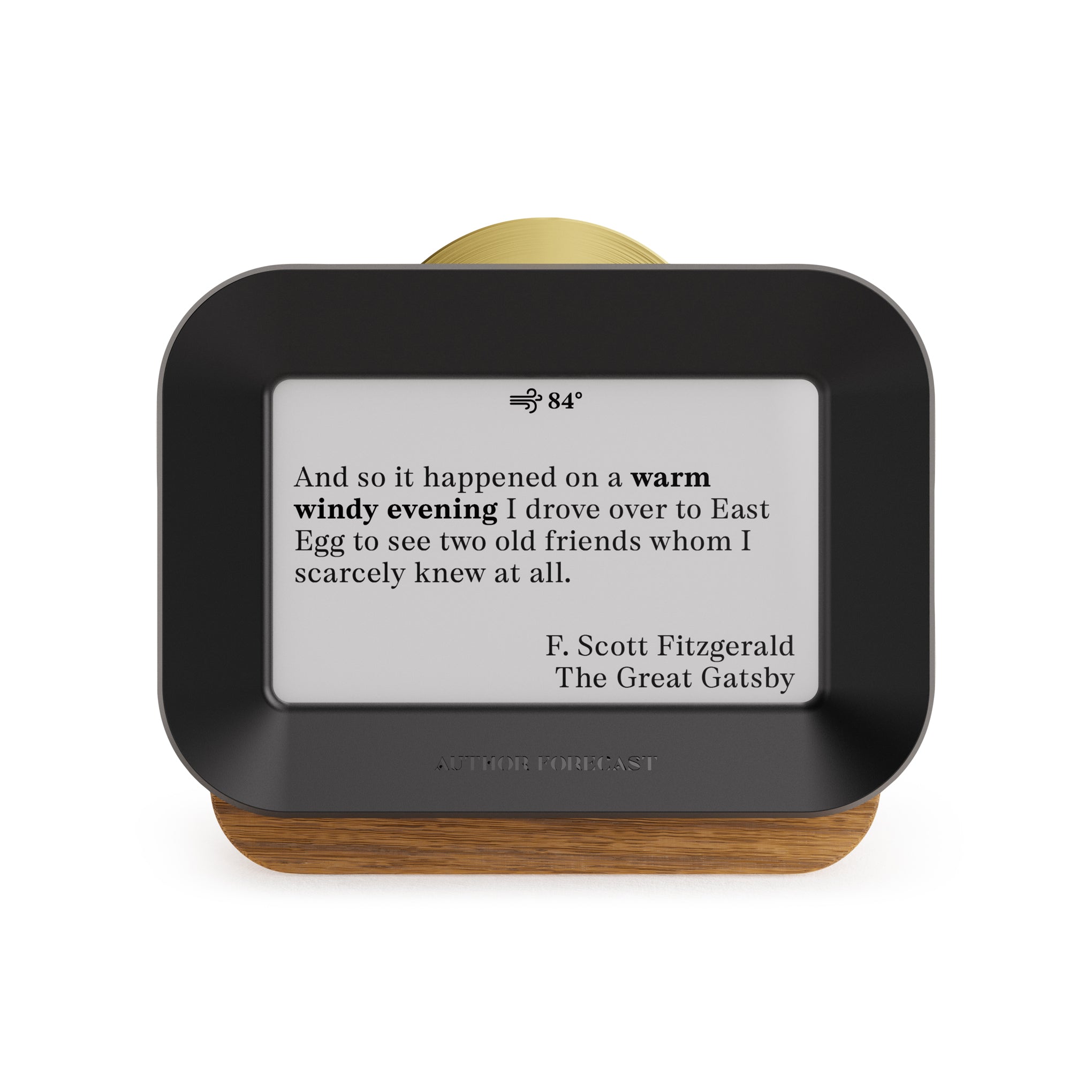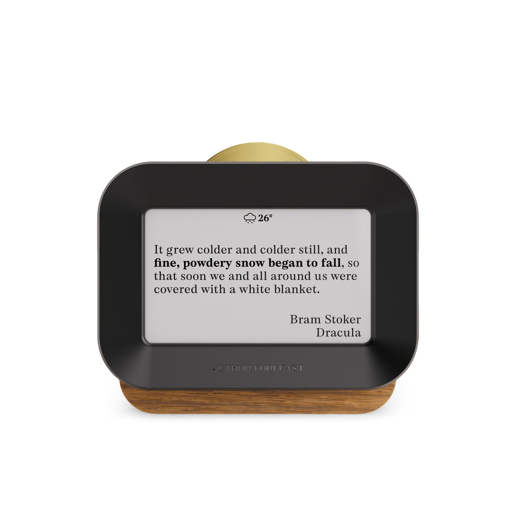 Get your weather forecast delivered by authors ranging from Homer to Hemingway with this digital weathervane that draws from a growing library of over 5.000 atmospheric literary quotes to select and display one that matches your local weather. Simply set this handsome object on a shelf or desk in your home office. kitchen or bedroom and watch the quotes change every 15–60 minutes. according to the rate you set. Crafted with a white oak housing and accented by a polished brass control sundial. the Author Forecast is a unique. elegant way to make the connection between literary history and your everyday environment.