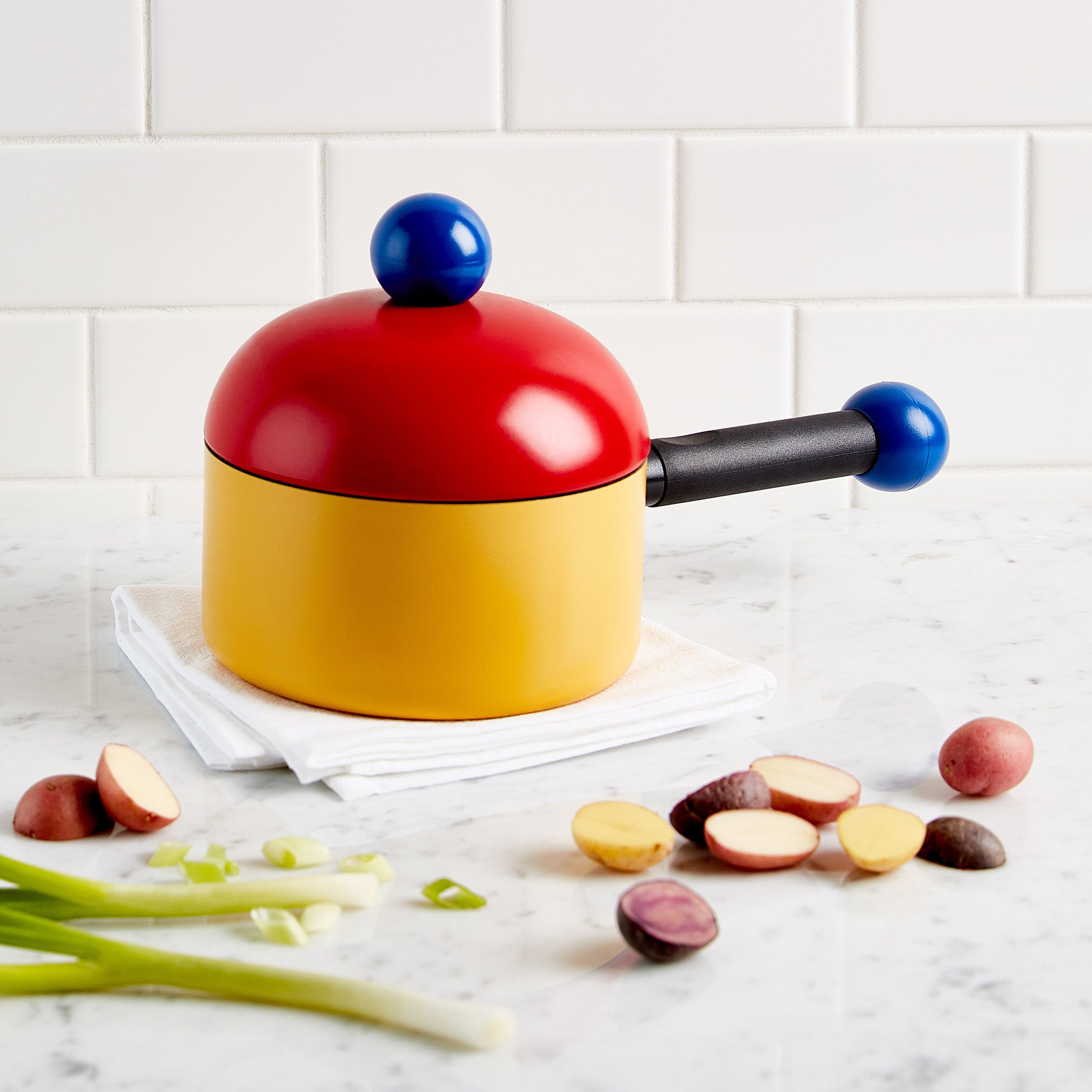 MoMA Exclusive: This Italian-made update of a 1994 Bubble Sauce Pot design offers playful. primary colors (red. blue and yellow). even heat distribution and a non-stick. anti-scratch coating. The Sauce Pot (7.75h x 6.5w x 13d) can be used on gas and electric stovetops or in an oven up to 320??F. This Bubble Sauce Pot is made from dishwasher-safe aluminum and Bakelite. Pair it with the Bubble Frying Pan and Bubble Casserole Pot for a matching set. Not for use with induction stovetops. This is an authentic Bubbleware product. produced by the Italian company TVS S.p.A.