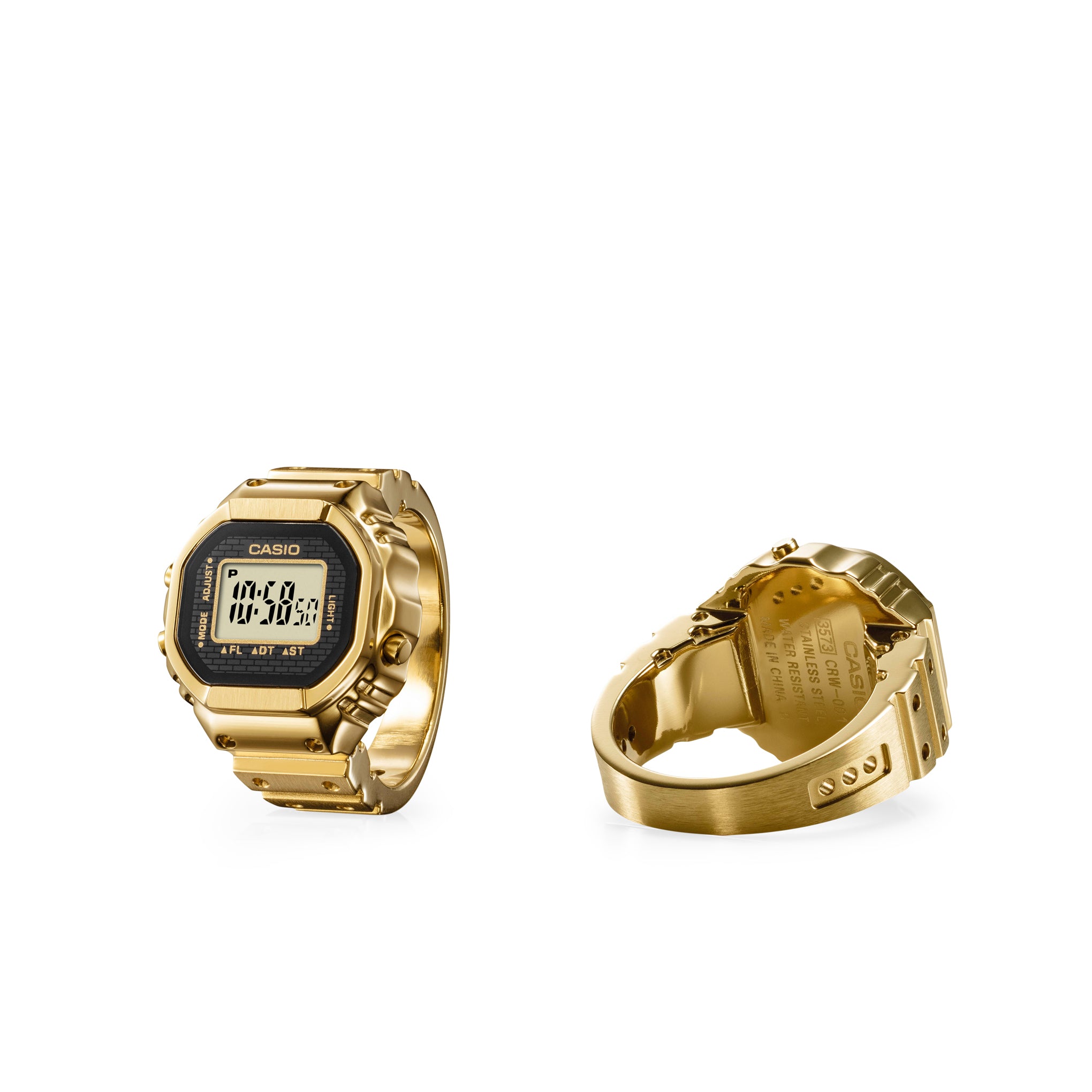 Wrap the Casio’s iconic G-Shock Watch around your finger with this digital watch ring. Created with a special method of metal processing that involves injecting a mixture of fine metal powders and resin into a mold. the ring is molded in one piece—with even the dimpled design on the band painstakingly reproduced.