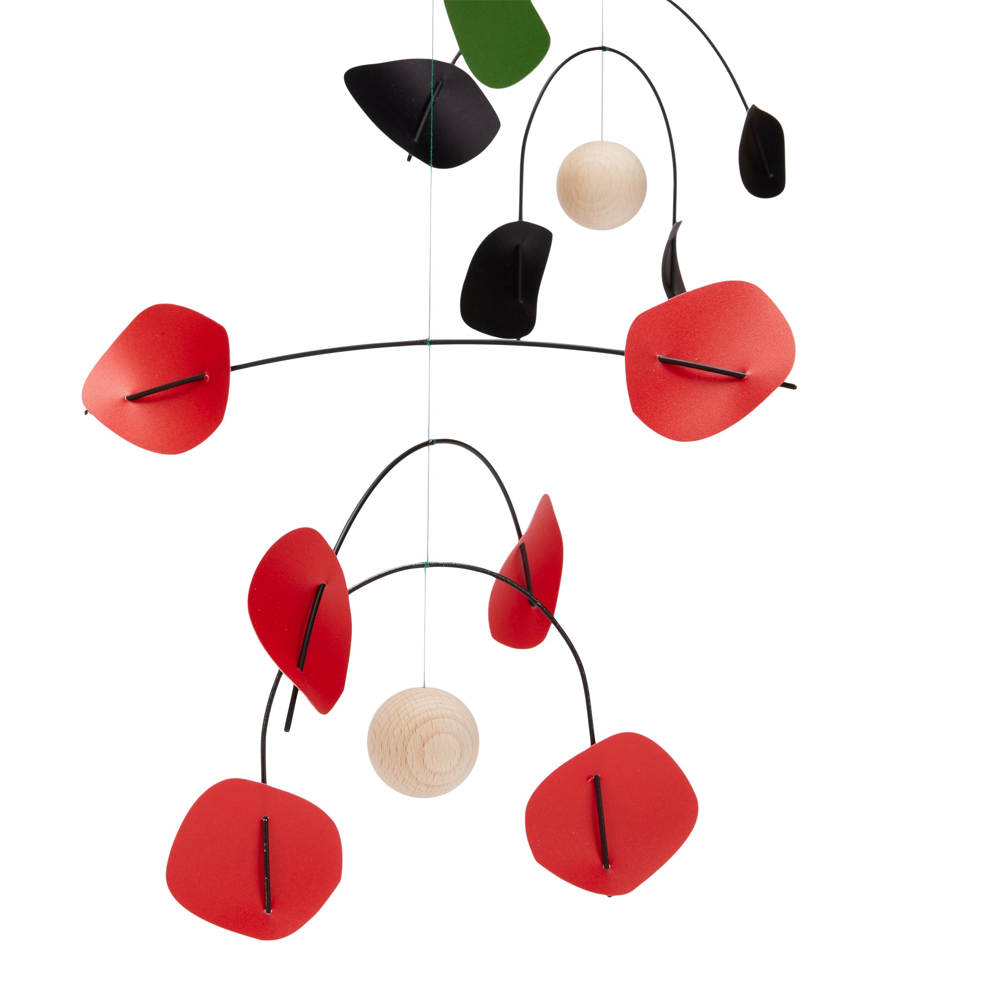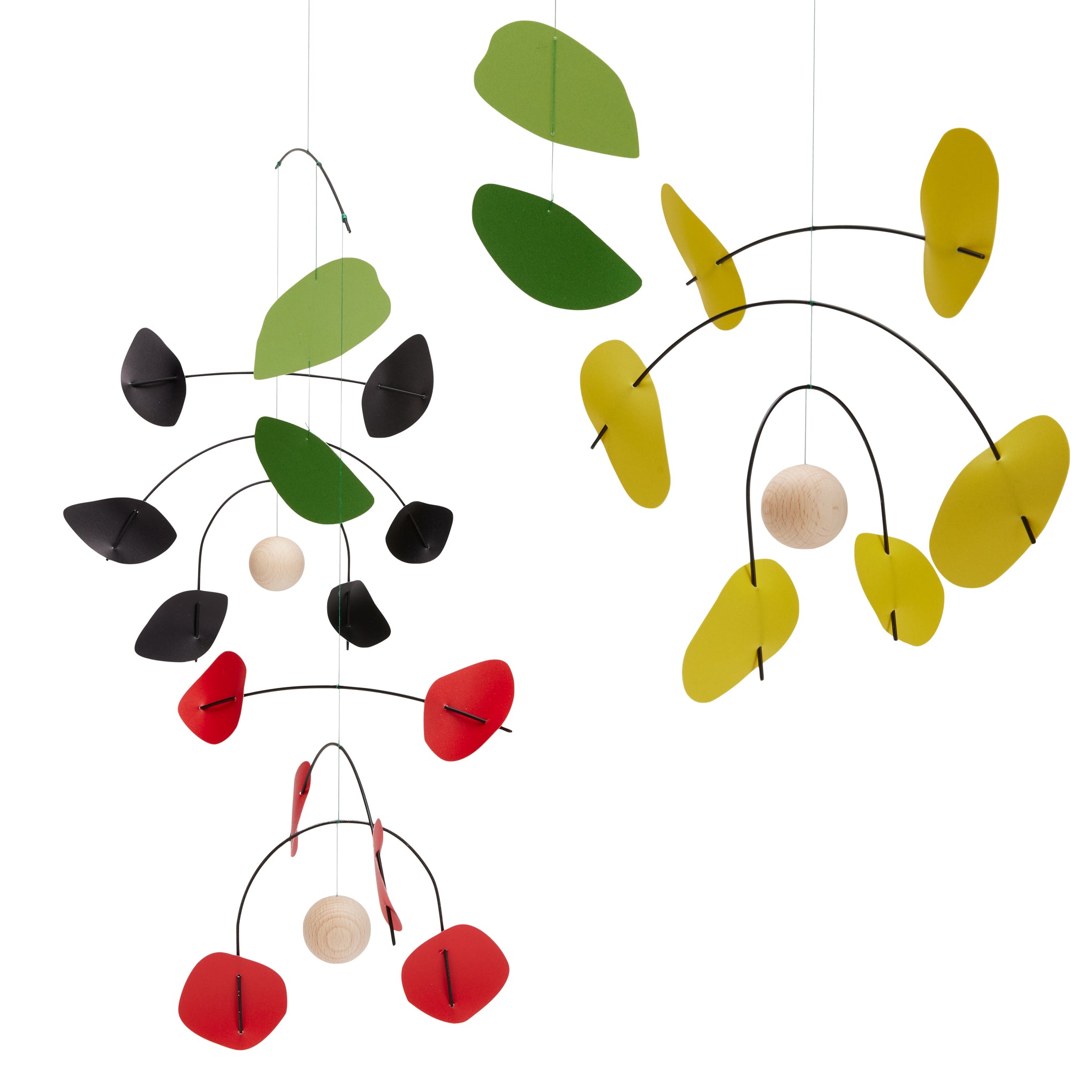 The Dusen Dusen Floral Hanging Mobile is made from polypropylene leaves and petals in green. red. yellow and black colors. and it measures approximately 28.5h x 31.50w x 31.50d. It includes a long thread-on paper hook for hanging. Hang away from direct sunlight to avoid color fading. To clean. carefully wipe with a dry cloth