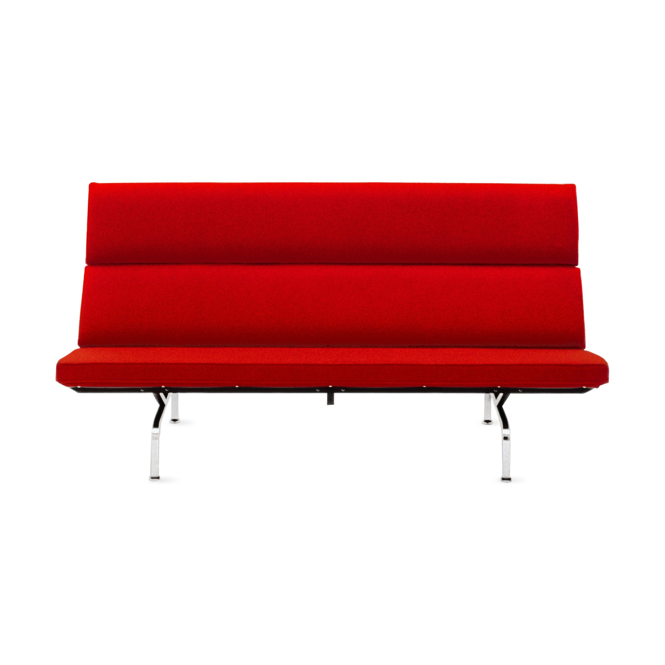 The Compact Sofa maintains a striking profile that evolved from a built-in sofa that Charles and Ray Eames. whose work is featured in the Museum’s collection. designed for the living room of their Pacific Palisades. California home. Two horizontal foam pads with welting cord form the sofa’s comfortably high back. while a black enameled steel frame and chrome-plated tubular steel legs with stainless-steel glides make up the sofa’s foundation. Upholstered in 100%-polyester crepe fabric. Made by Herman Miller®.
