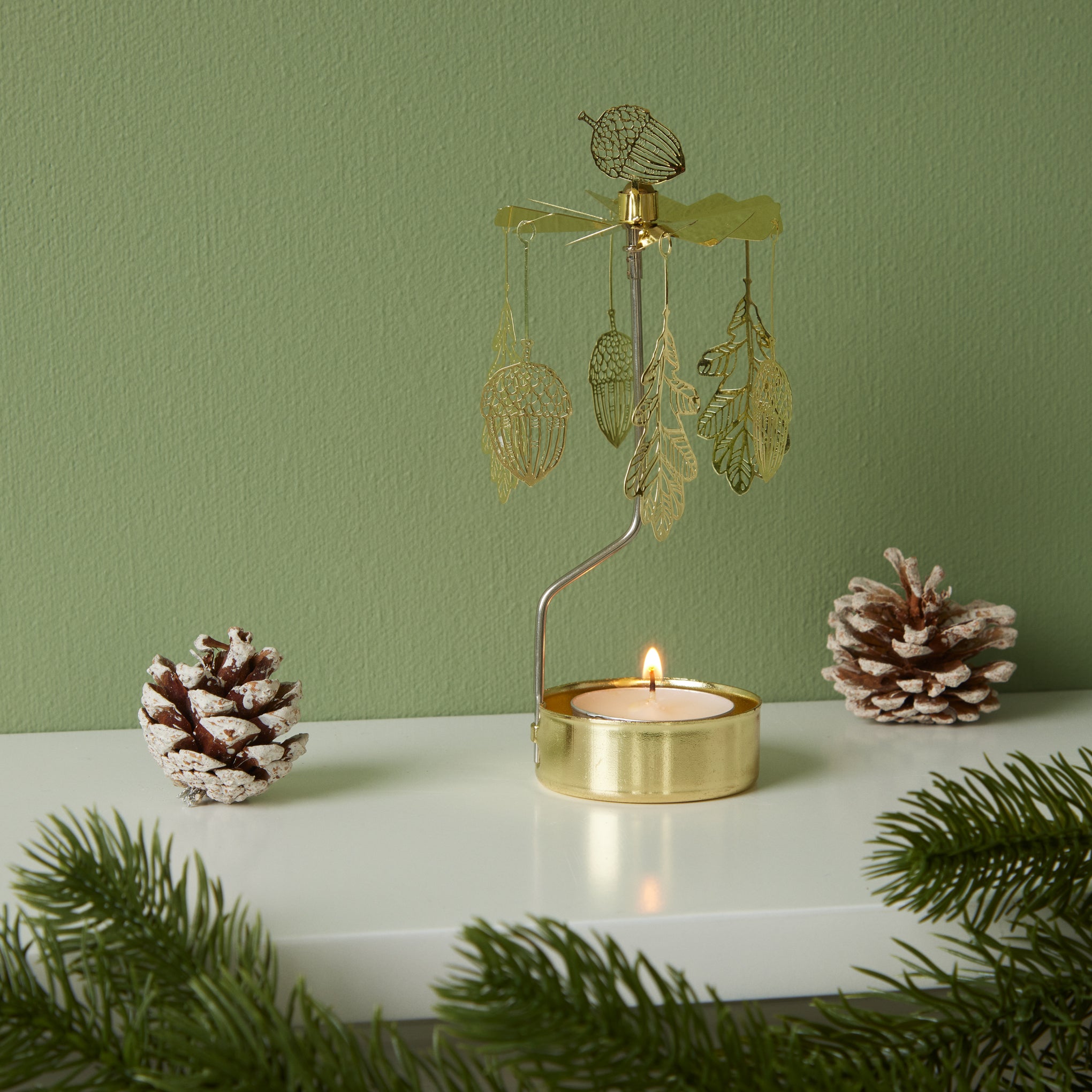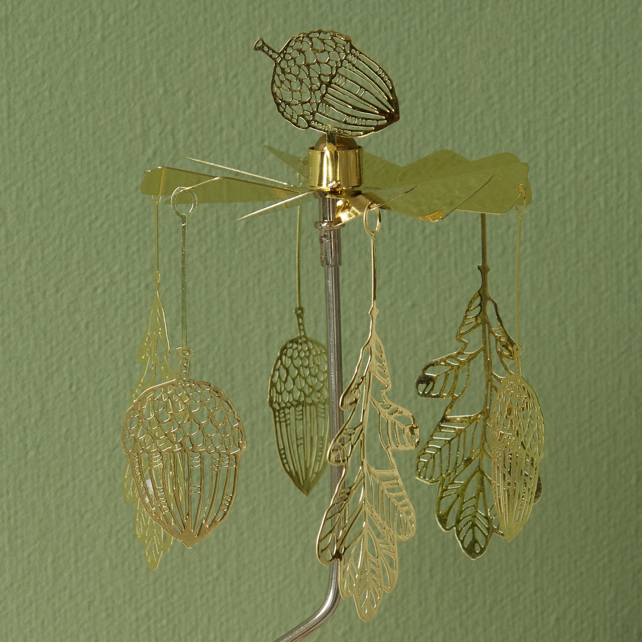 This autumnal Fall Foliage Rotary Tea Light Candle Holder features a tree-inspired mobile that rotates when a lit votive candle is placed in the stand’s holder. The tree is adorned with fall foliage motifs. Candles not included. The Fall Foliage Rotary Tea Light Candle Holder is made in Sweden from plated iron and measures 6h.