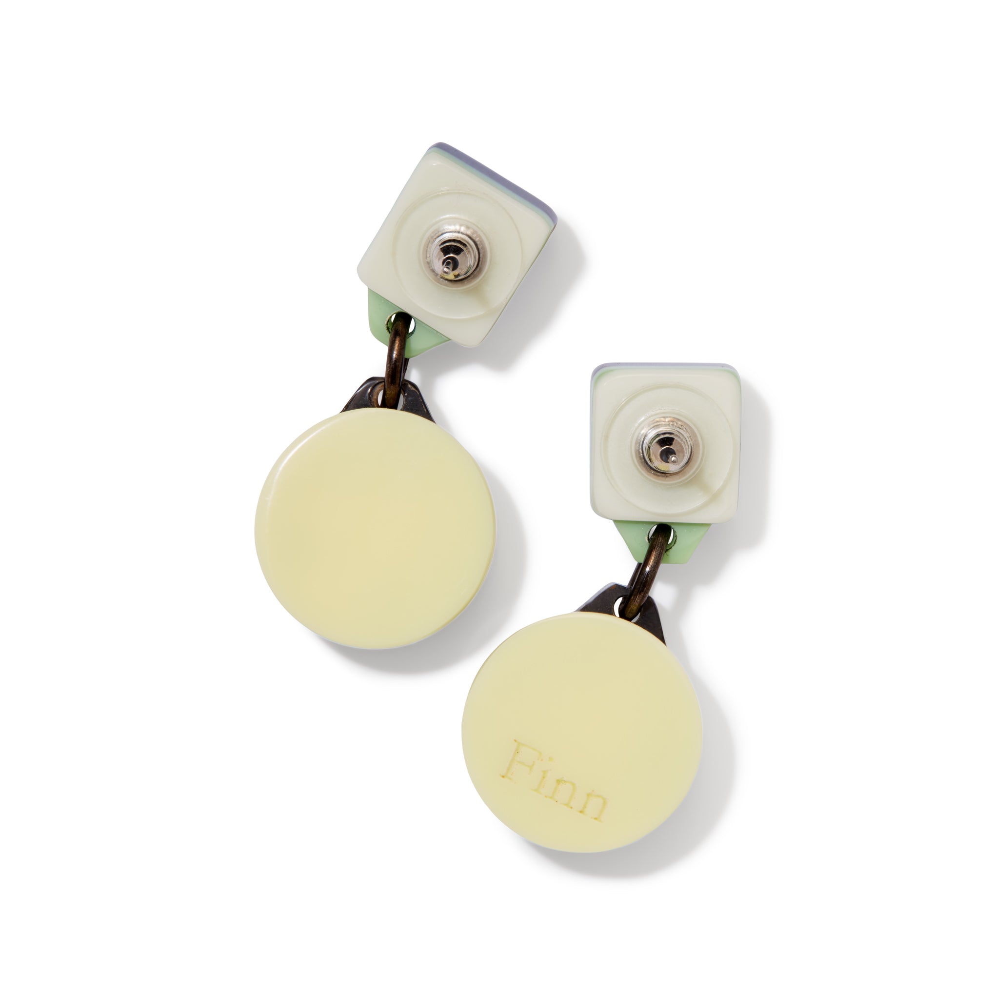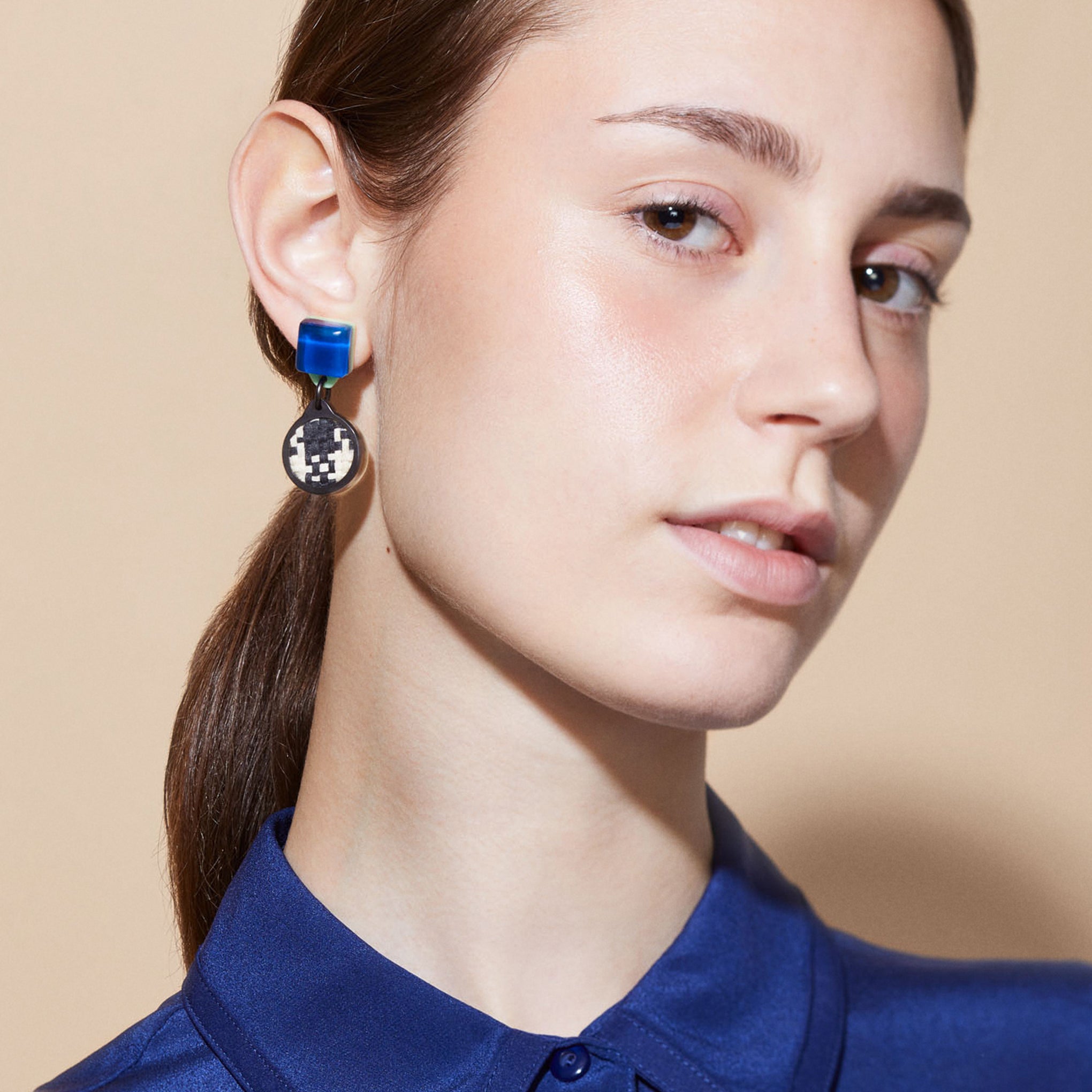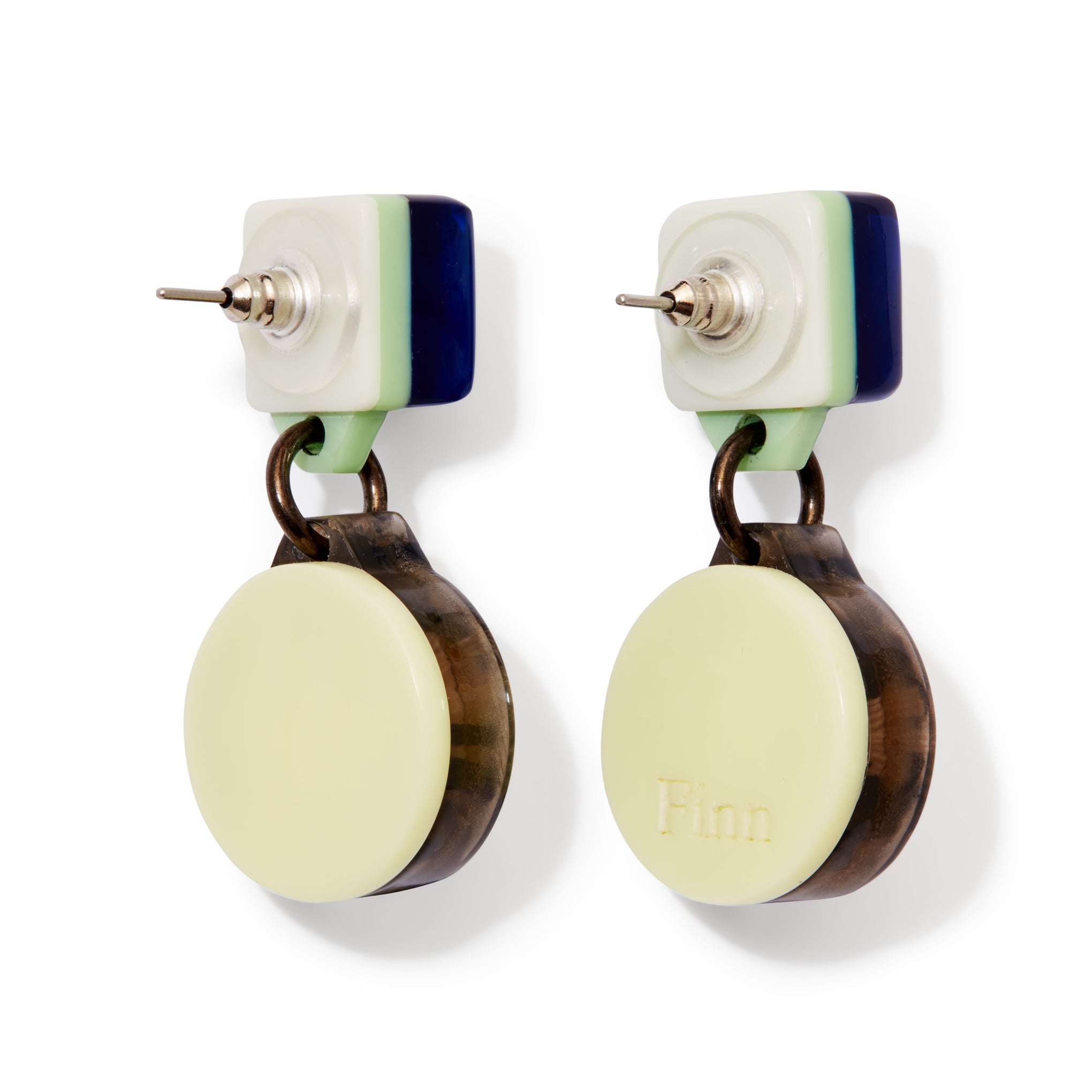 Inspired by artistic references and a colorful palette. jewelry designer Paula Giecco creates special sculptural designs for her Buenos Aires-based brand named Finn. These Vita Drop Earrings feature hanging geometric shapes crafted of hand-dyed and hand-spun raffia scraps leftover from a family-owned factory that specializes in woven patterns including houndstooth. criss cross and checkered. Each pair is also made with cellulose acetate. a degradable material upcycled from optical manufacturing discards. A blend of style and sustainability. they have surgical steel posts as well as stainless steel and acrylic backs. Due to the recycled and artisanal nature of the craftsmanship. items may vary slightly in texture and color. The Finn Vita Drop Earrings are available in Blue/Black (measures 1.61l x 0.79w x 0.32d). Red/Green (measures 1.58l x 0.71w x 0.32d) and Natural/Blue (measures 1.85l x 0.75w x 0.32d).