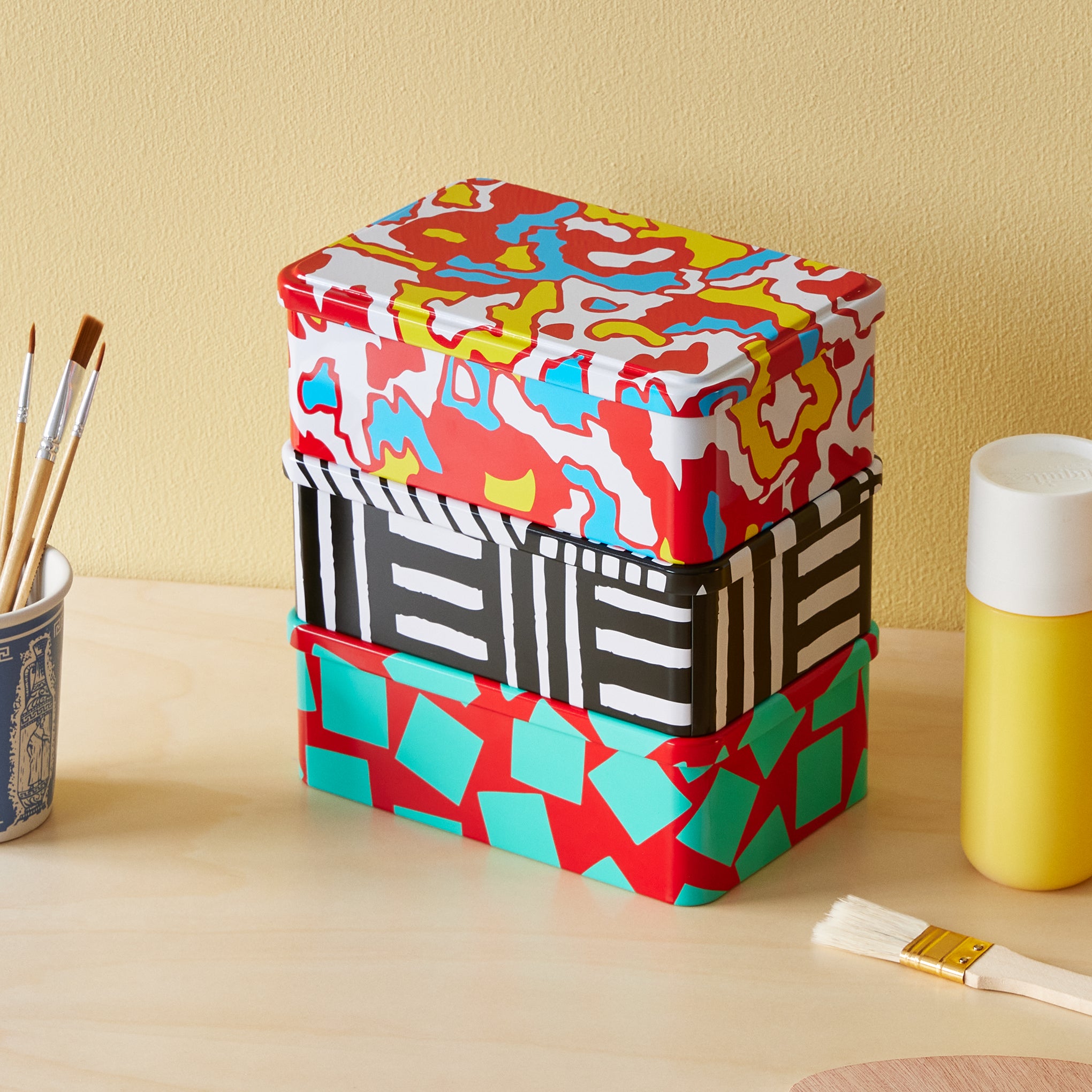 MoMA Exclusive: Adorned with the kind of colorful and energetic patterns that designer George Sowden is known for. this versatile tin has multiple functions. Use it to store dry ingredients. keepsakes. photos. jewelry. art supplies. small toys. candy. shell and rock collections—the possibilities are endless. George Sowden is a founding member of the Memphis Design Group and Memphis designs are represented in MoMA’s collection. The George Sowden Horizontal Tin has a lid. is made from plated tin and measures 3h x 5w x 8d.