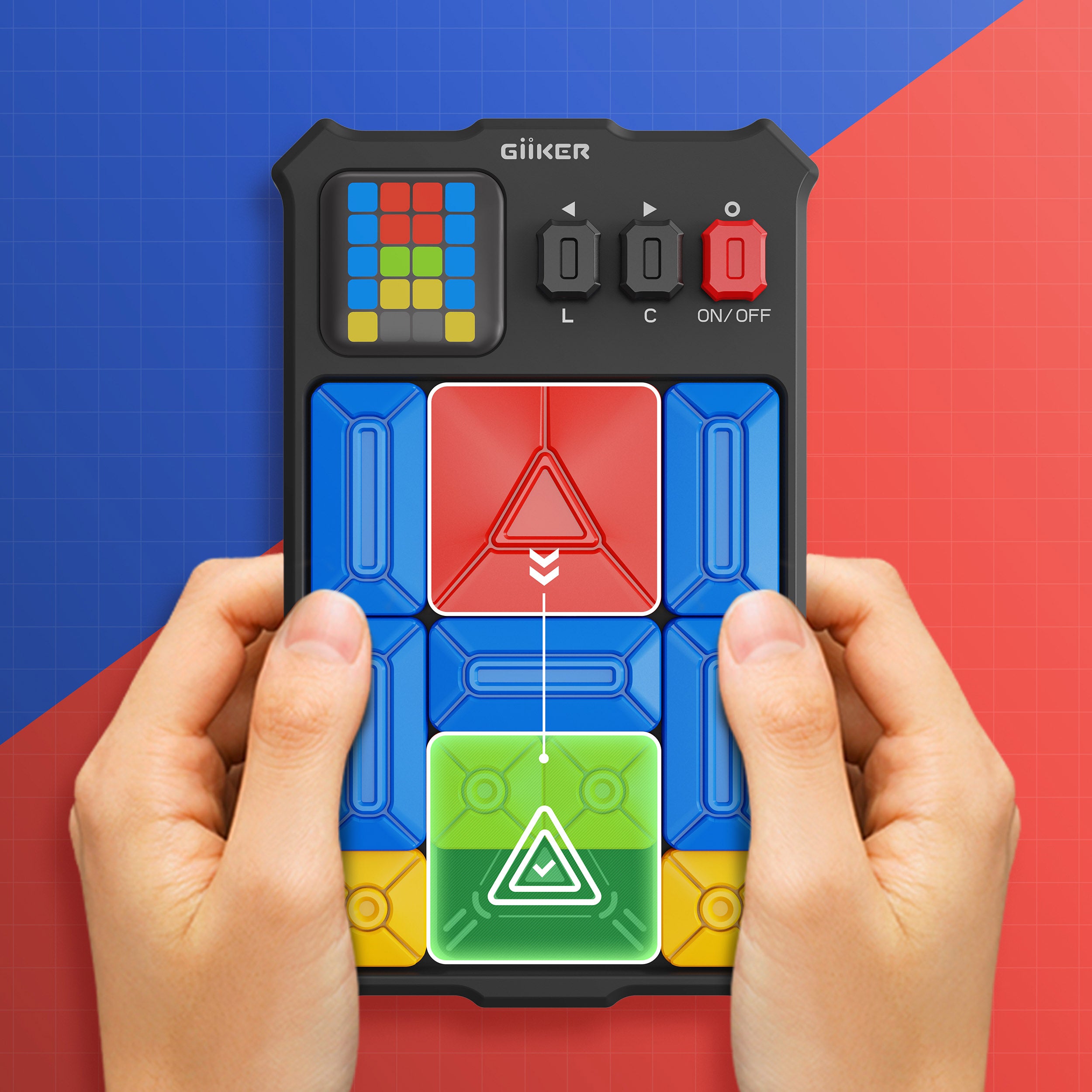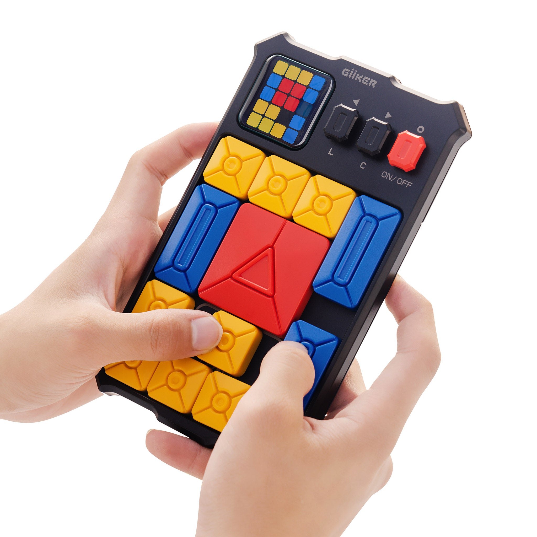 This simple. intuitive sliding jigsaw game gives your spatial skills a workout through over 500 puzzles. with the difficulty progressing just a little bit on each one. After you arrange the red. yellow and blue plastic pieces according to the color-coded LED screen in the top left corner. your job is to slide them around until the large red piece can sit in its clearly marked place at the center bottom of the board. Once it’s there. the game automatically detects a win and moves you on to the next puzzle. A great way to limit screen time and develop spatial reasoning skills for adults and kids alike. the Giiker Super Slider game has a Learn Mode that gives you hints for the next step as well as a Challenge Mode that rates your solution time from Fail to Super. Its small. handheld design makes it a great travel-friendly toy. The Giiker Super Slider Game is powered by two AA batteries (not included) and measures 6.7h x 4.35w x 0.9d.  Ages 6+.