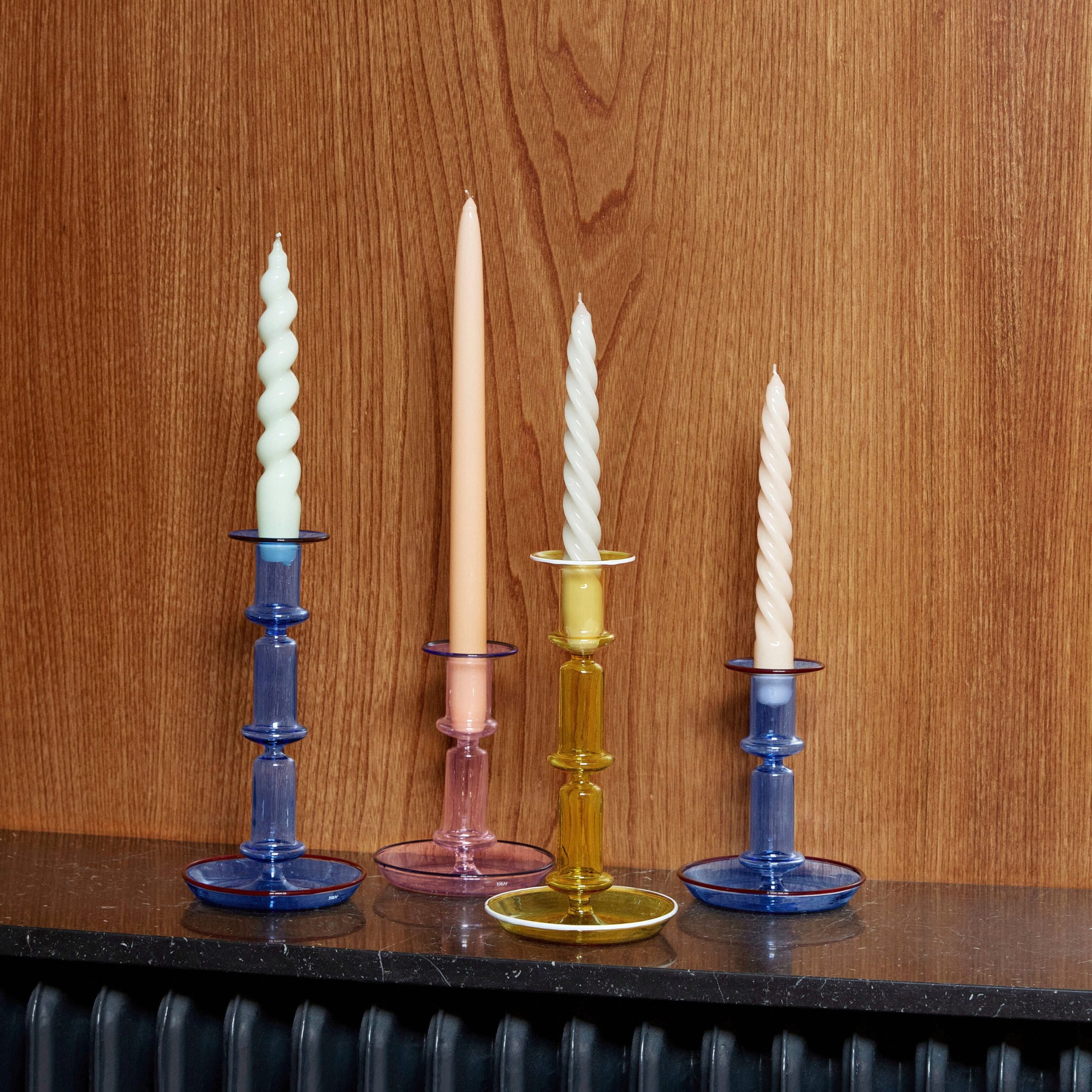 This translucent Flare Candle Holder from Danish brand HAY has been crafted out of colored. mouth-blown borosilicate glass. Its raised cup is shaped to hold most standard candles and its bowl-like lower tray catches melted wax and provides easy handling when moving the holder around your home.?HAY is a manufacturer with work in MoMA’s collection.