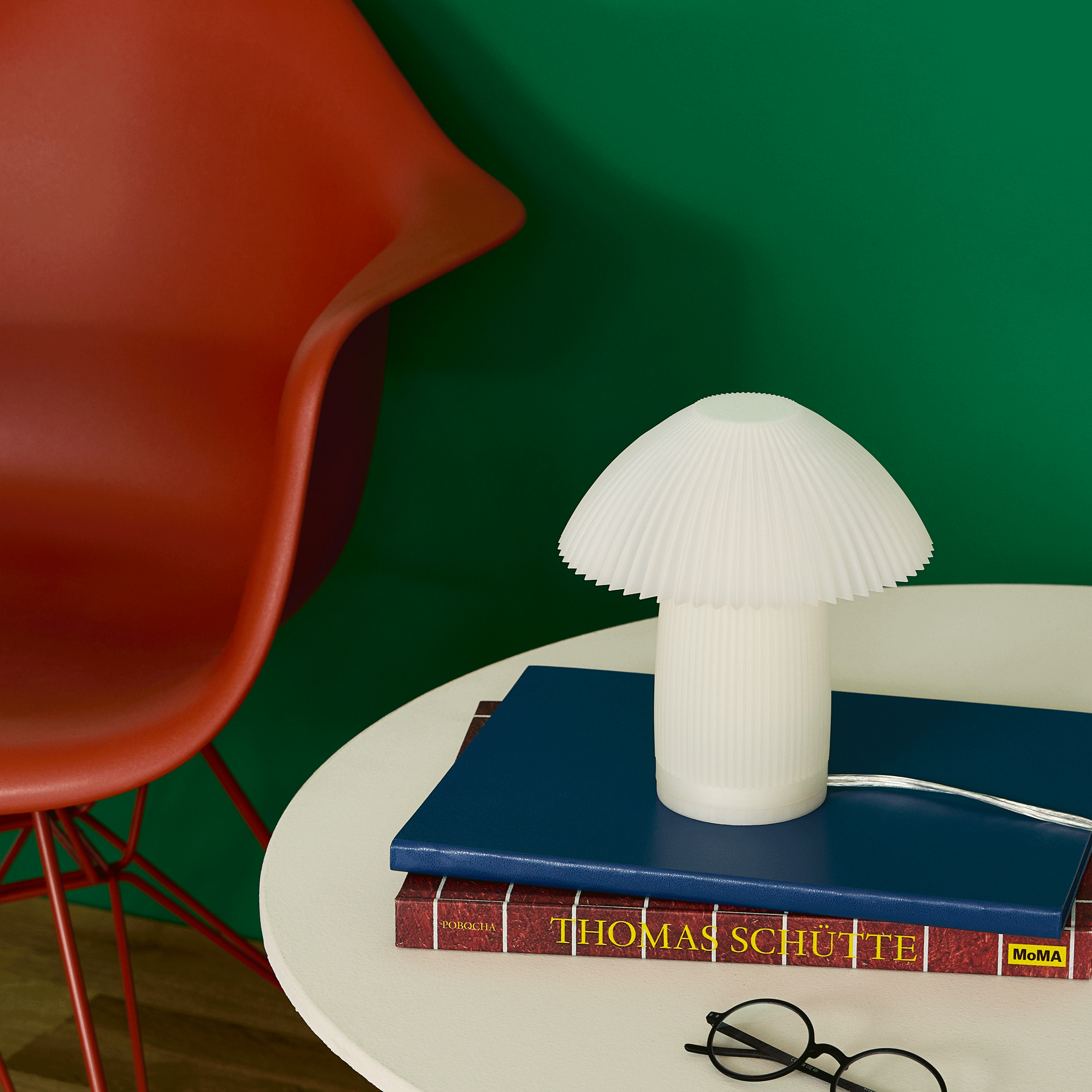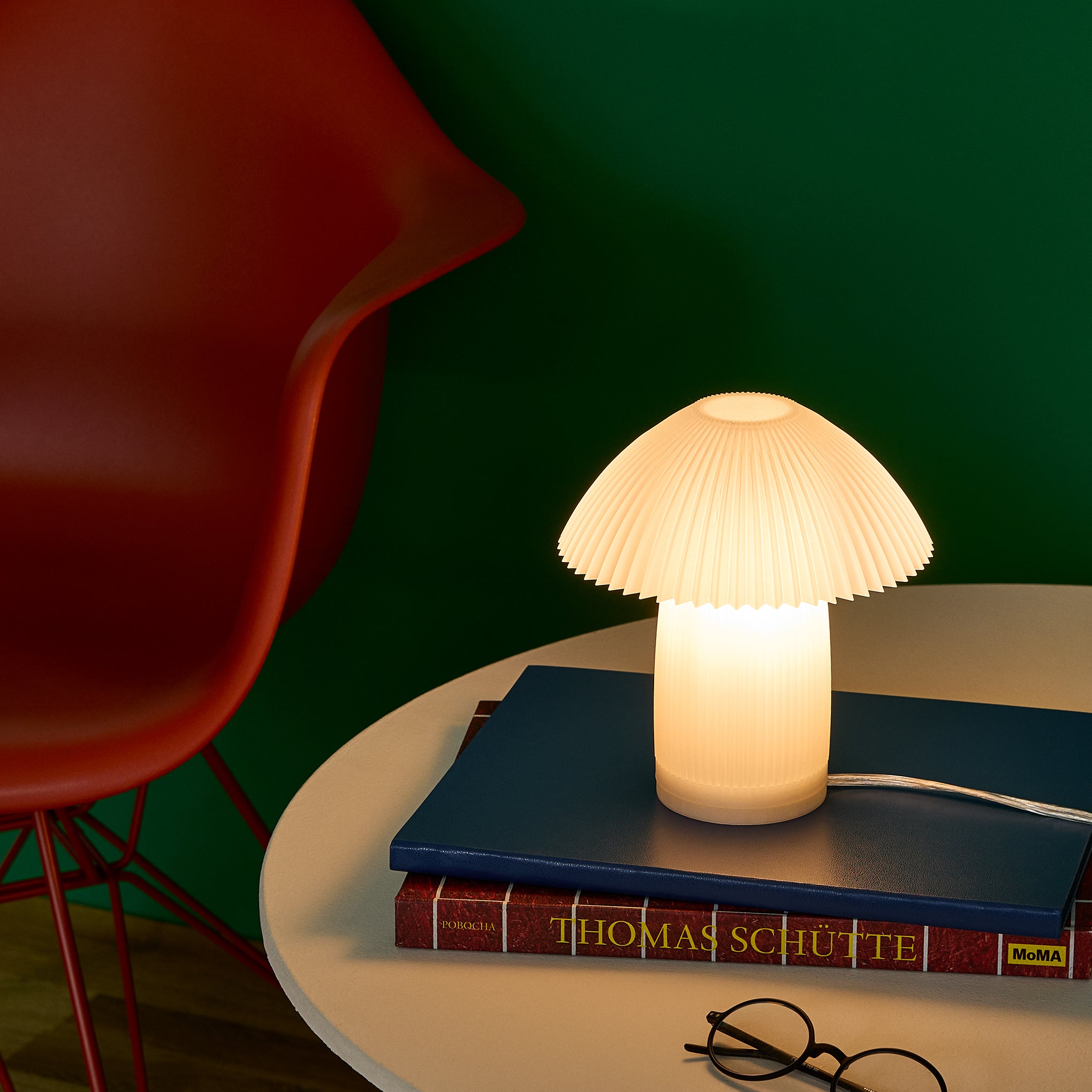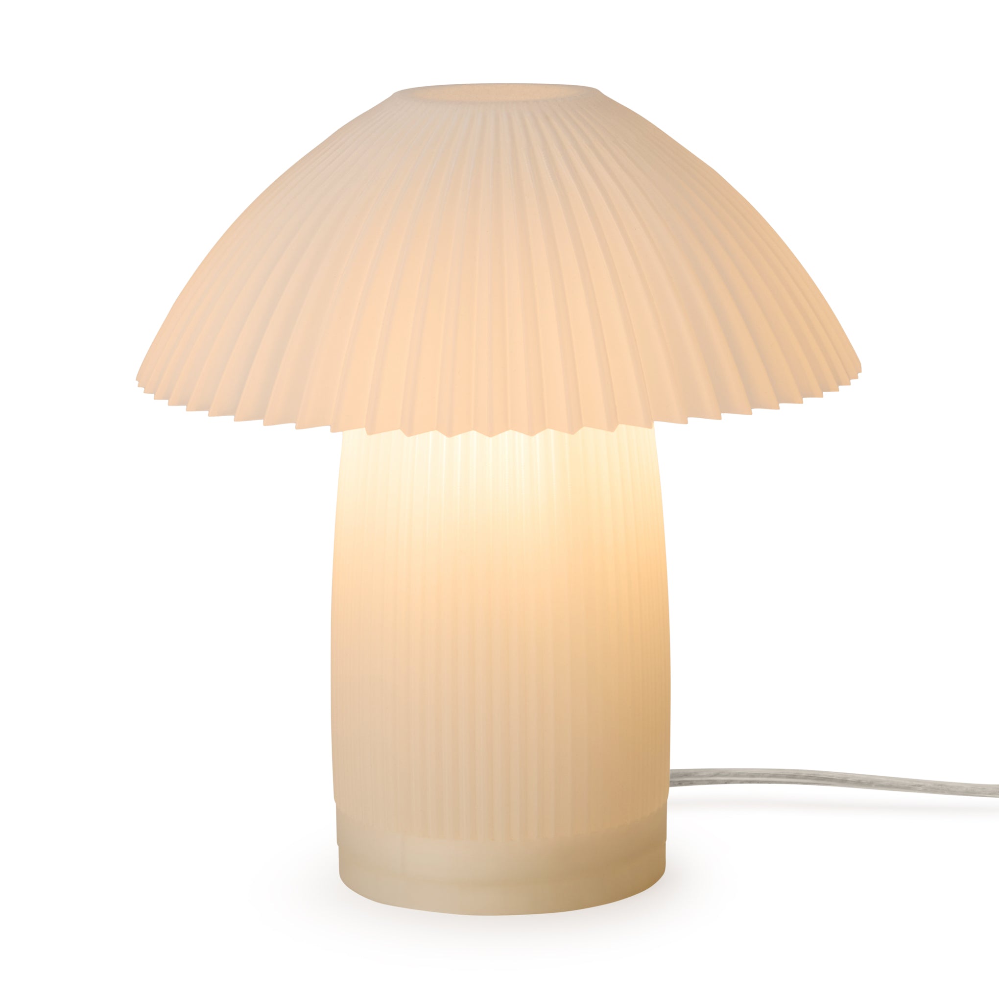 MoMA Exclusive: From the designer of the best-selling Wavy Lamp. Sean Kim. comes this lamp with a design inspired by mushrooms and pleated fabric. (Kinoko is Japanese for mushroom.) Using the 3D-printing technique Kim is known for at the Brooklyn-based brand Wooj. the Kinoko Lamp is composed of recycled PLA plastic in an accordion pattern. The quality of the light it emits is soft and diffuse. thanks to the carefully engineered 3D-printed plastic. Made in Brooklyn. it uses an LED 2W E12 bulb (included) The Kinoko Table Lamp measures 7.5h x 6.5diam. and is powered by standard plug-in with an 8l cord. Some assembly required.