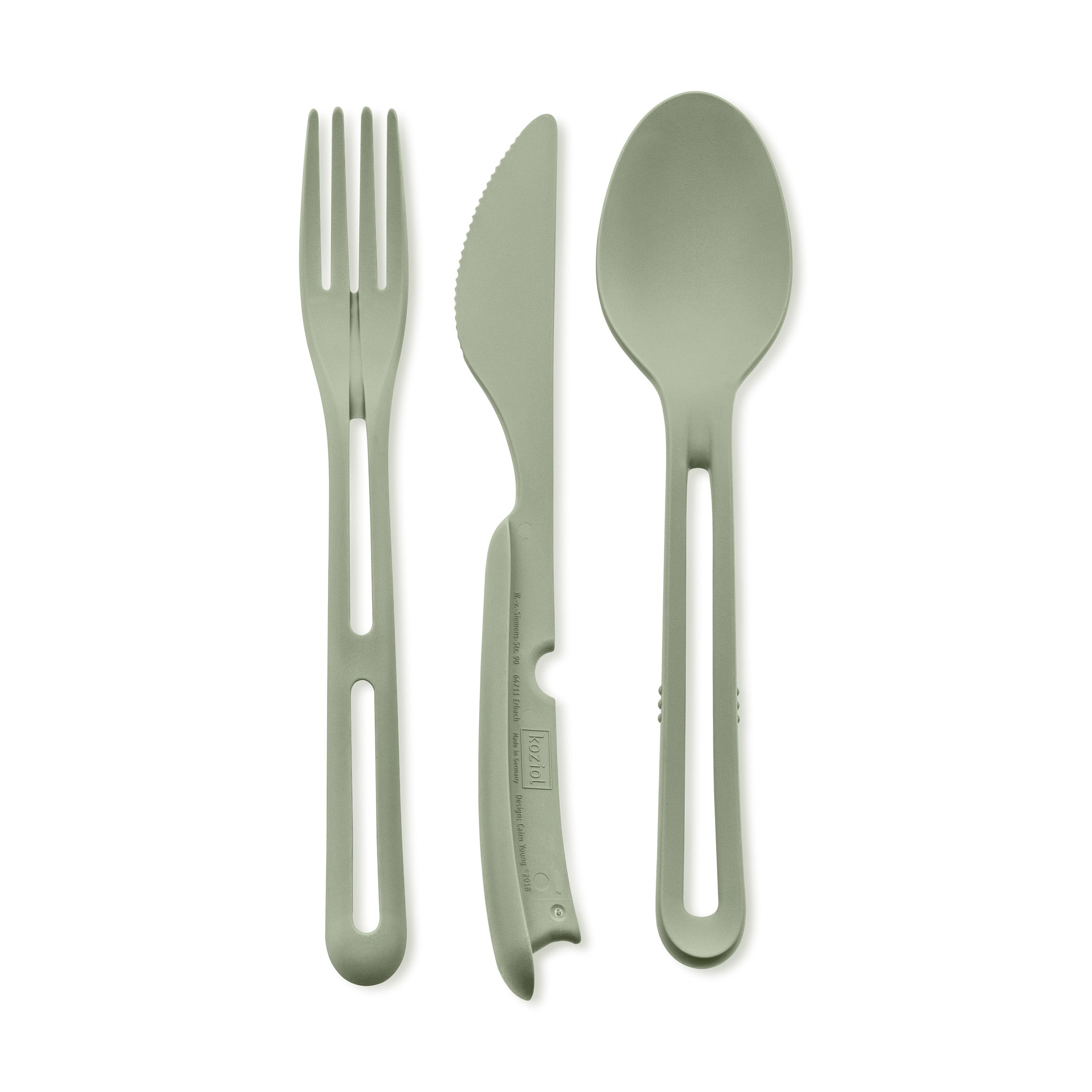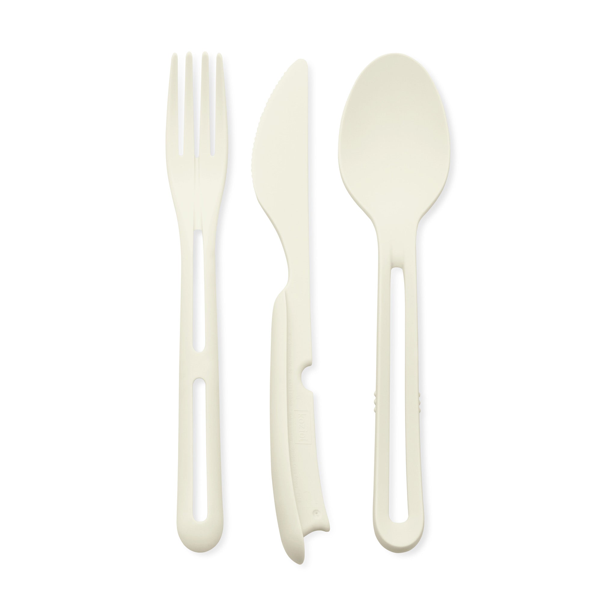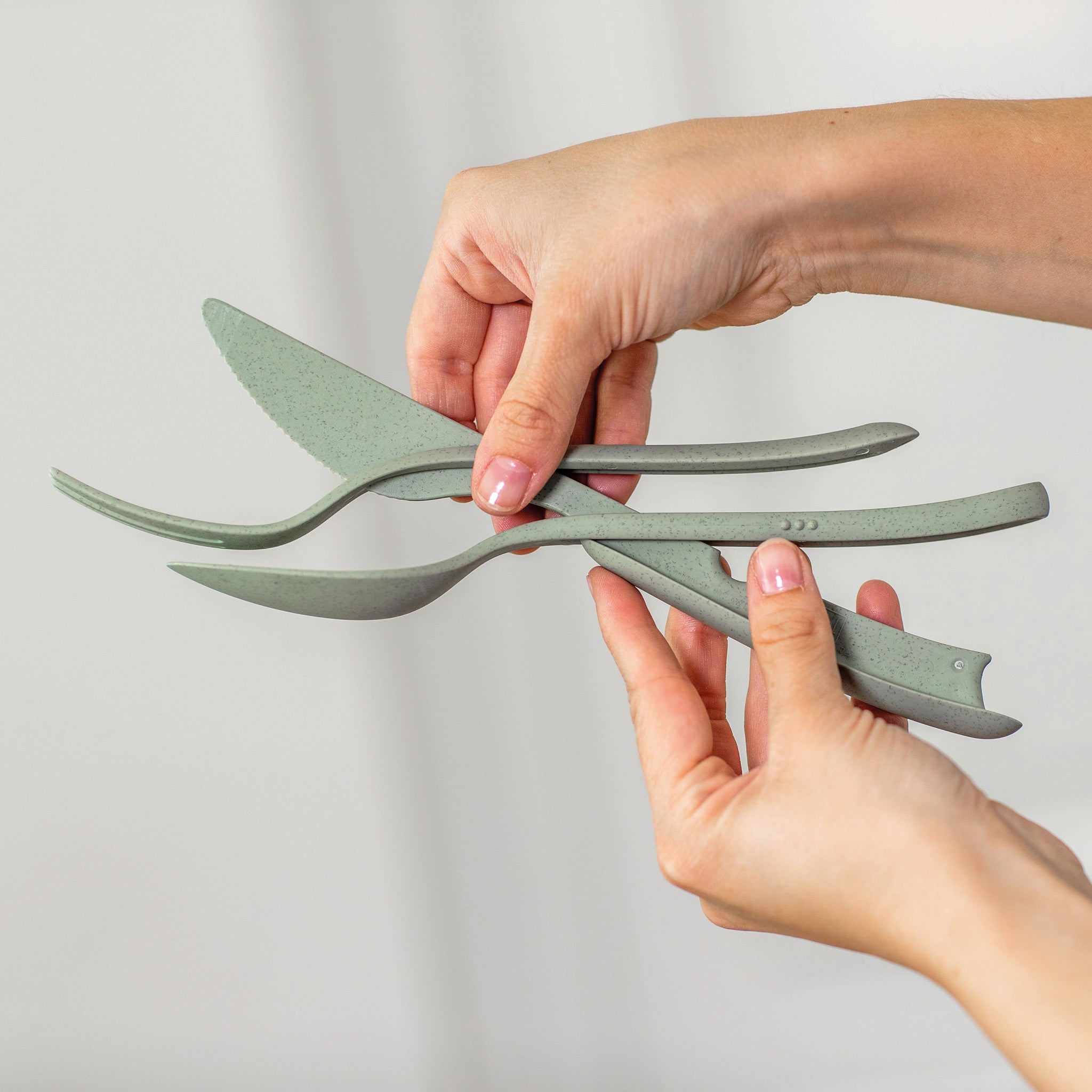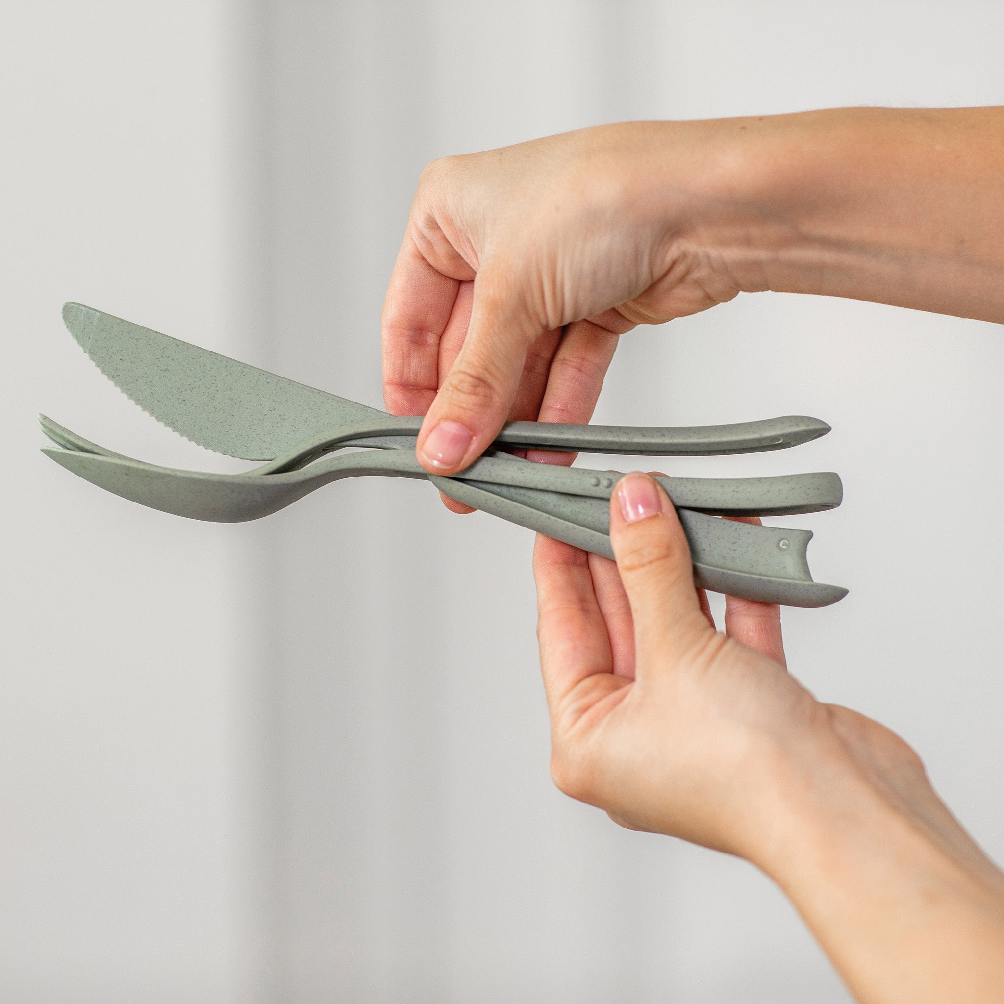 Cleverly designed to fit together in a compact. on-the-go package. this reusable. three-piece Klikk Flatware Set includes a knife. fork and spoon. and is a smart alternative to disposable plastic. Ideal for meals at work or weekend picnics. the 8.75 long Klikk Cutlery Set is made in Germany from 100% recyclable and sustainable thermoplastic. The pieces are dishwasher-safe and heat-resistant to 428??F (220??C).