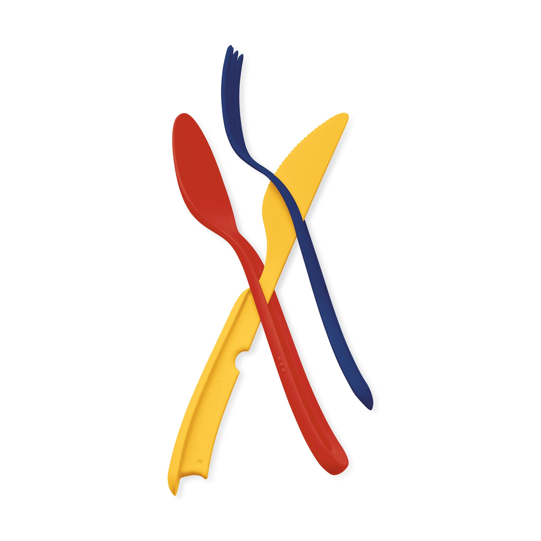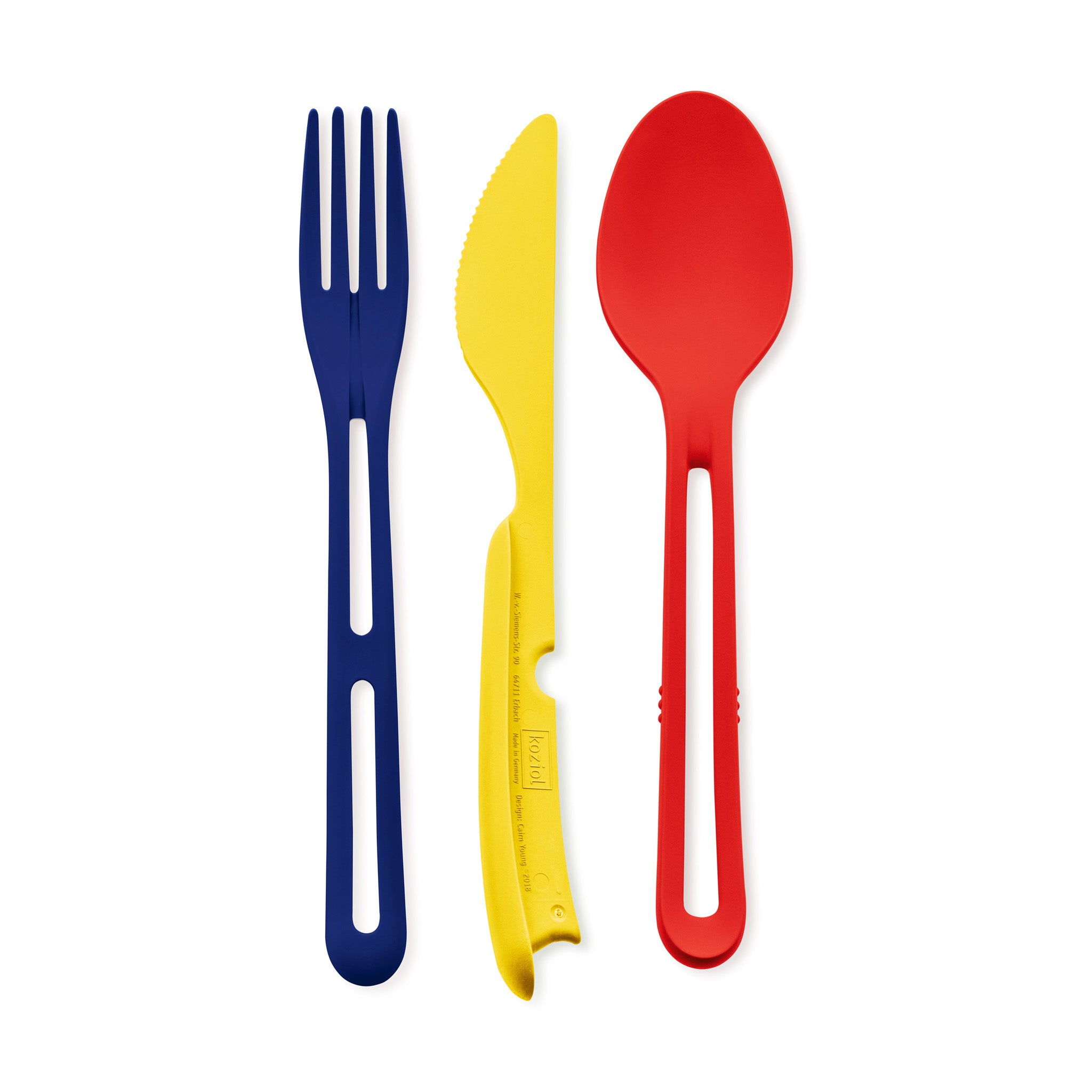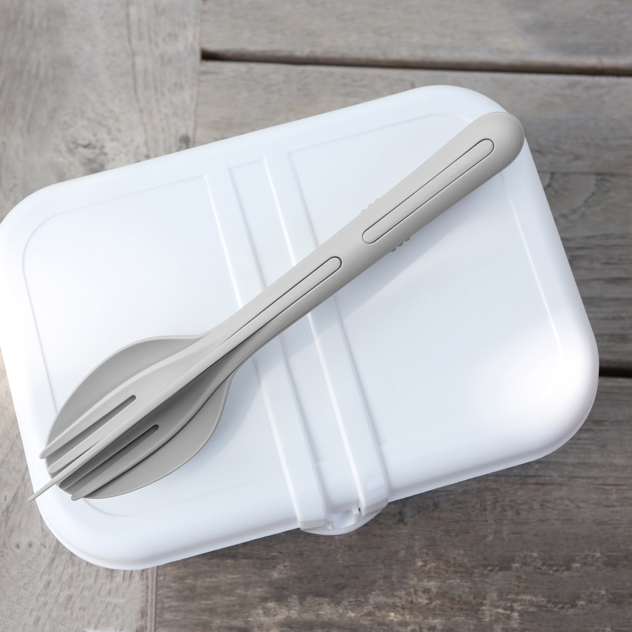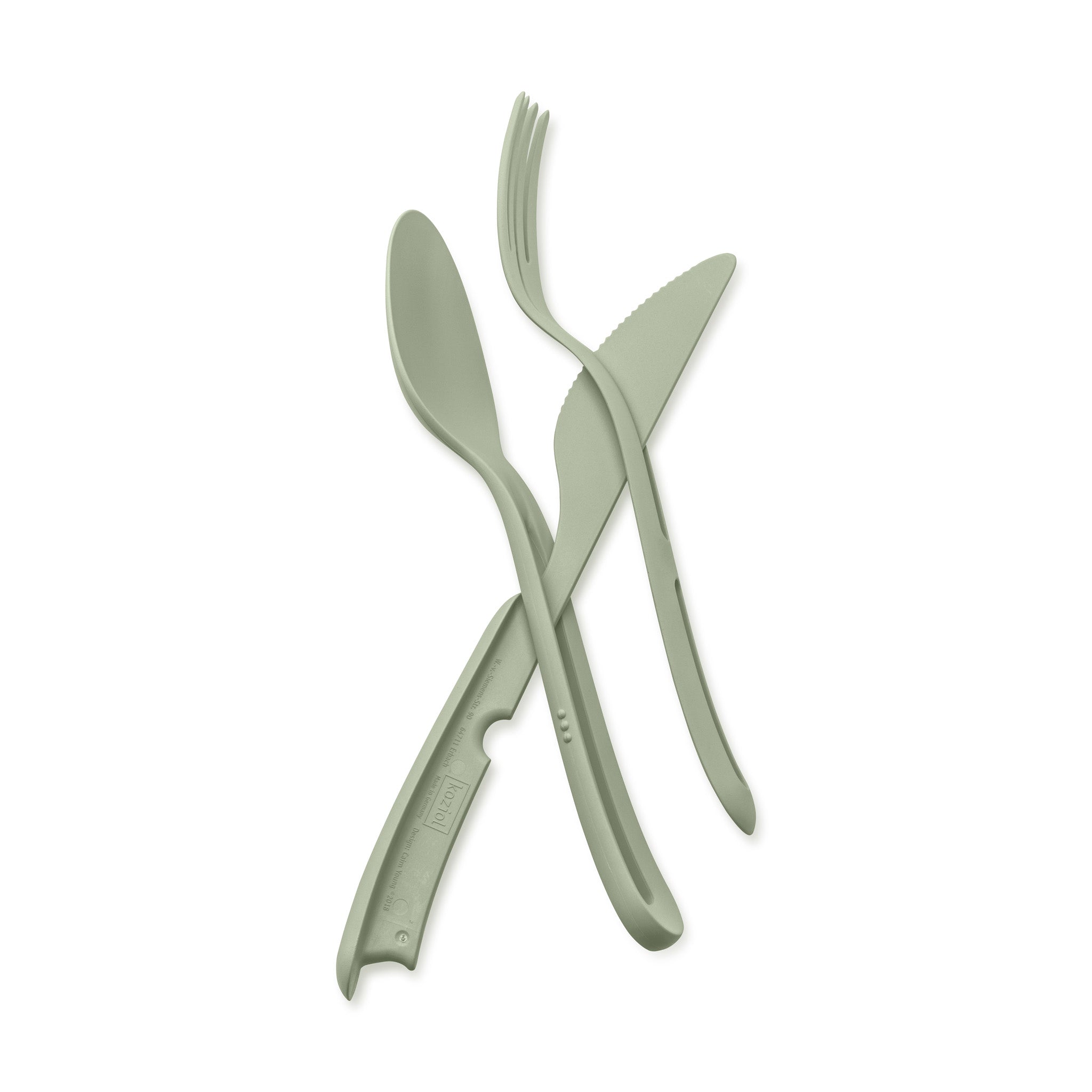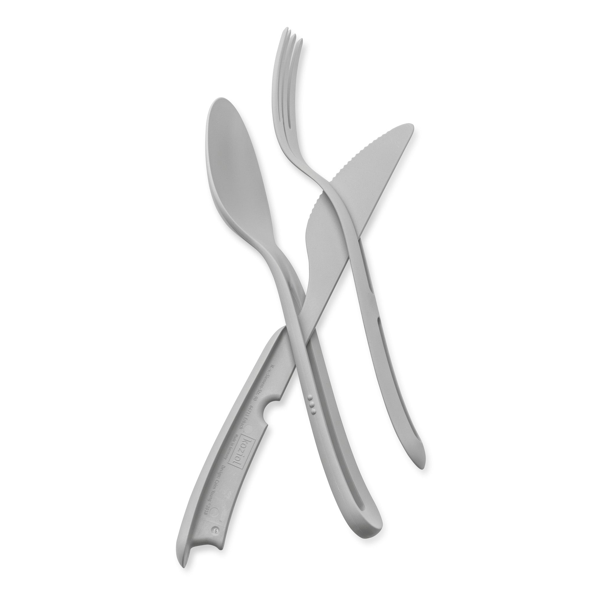 Cleverly designed to fit together in a compact. on-the-go package. this reusable. three-piece Klikk Flatware Set includes a knife. fork and spoon. and is a smart alternative to disposable plastic. Ideal for meals at work or weekend picnics. the 8.75 long Klikk Cutlery Set is made in Germany from 100% recyclable and sustainable thermoplastic. The pieces are dishwasher-safe and heat-resistant to 428??F (220??C).