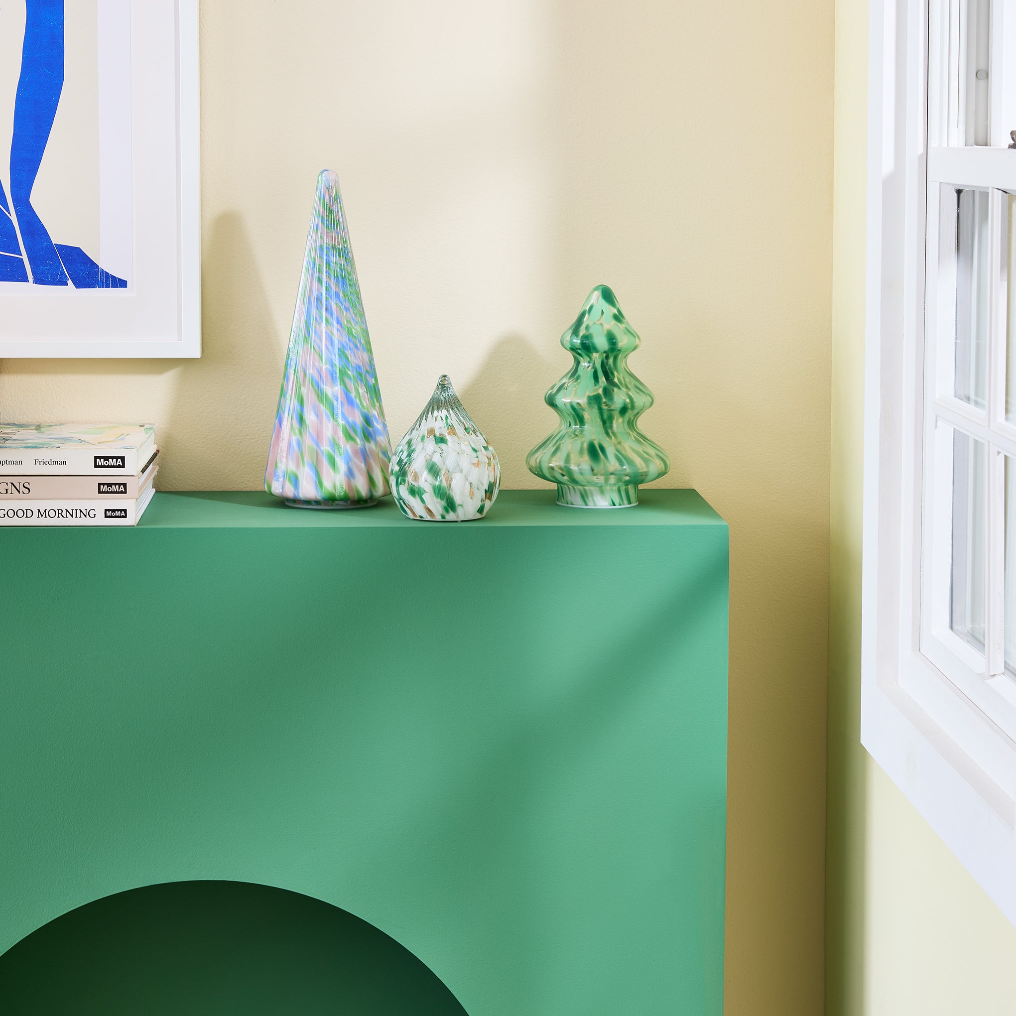 MoMA Exclusive: This marbled glass tabletop decor illuminates with warm LED lights to create a celebratory glow. The three styles. sold separately. feature a modern tree with a sleek silhouette. a classic tree with a tiered silhouette. and a sparkling snowdrop to create a unique and fresh arrangement that will brighten up any holiday setting. Timer function included for six hours on and 18 hours off. Requires batteries (not included. see below).