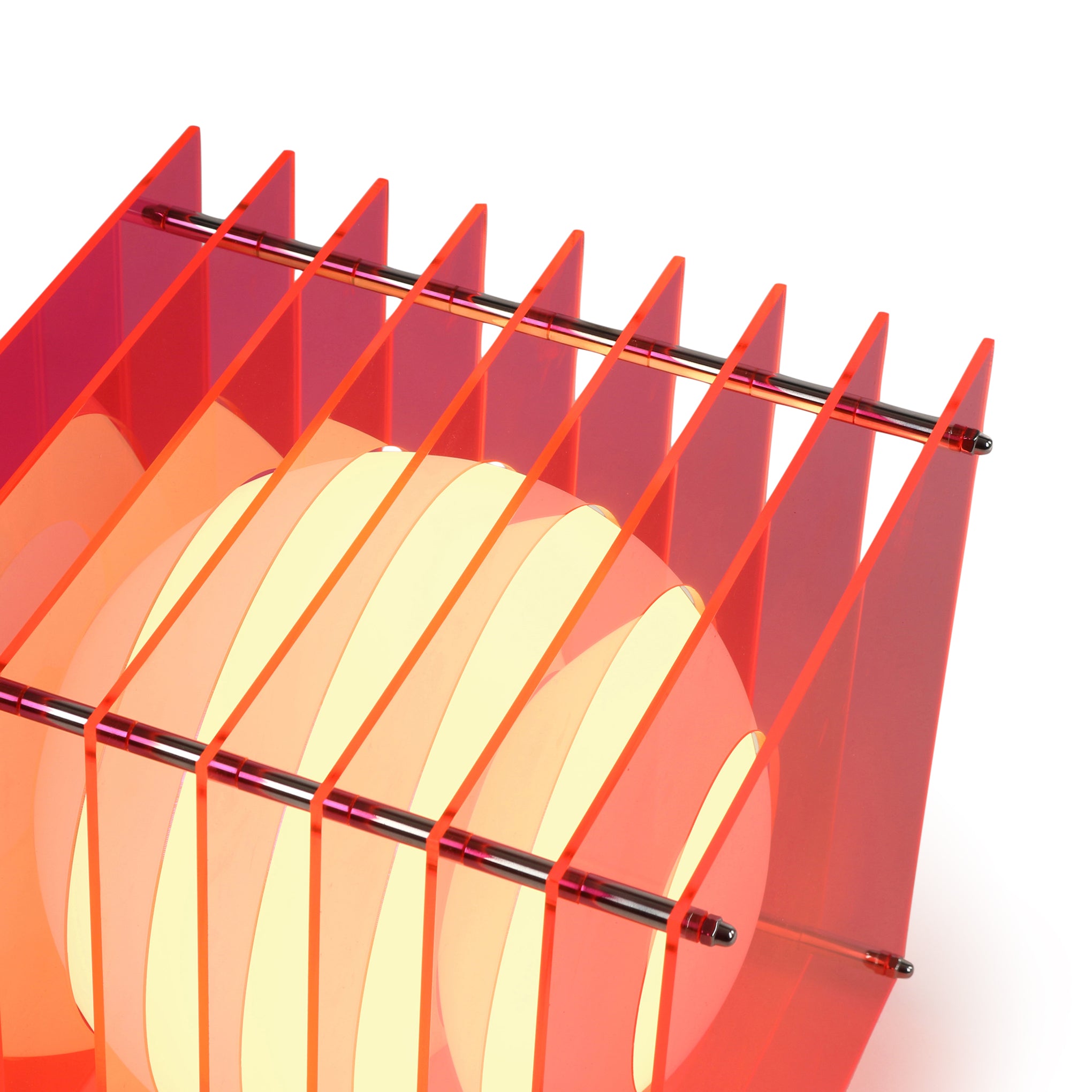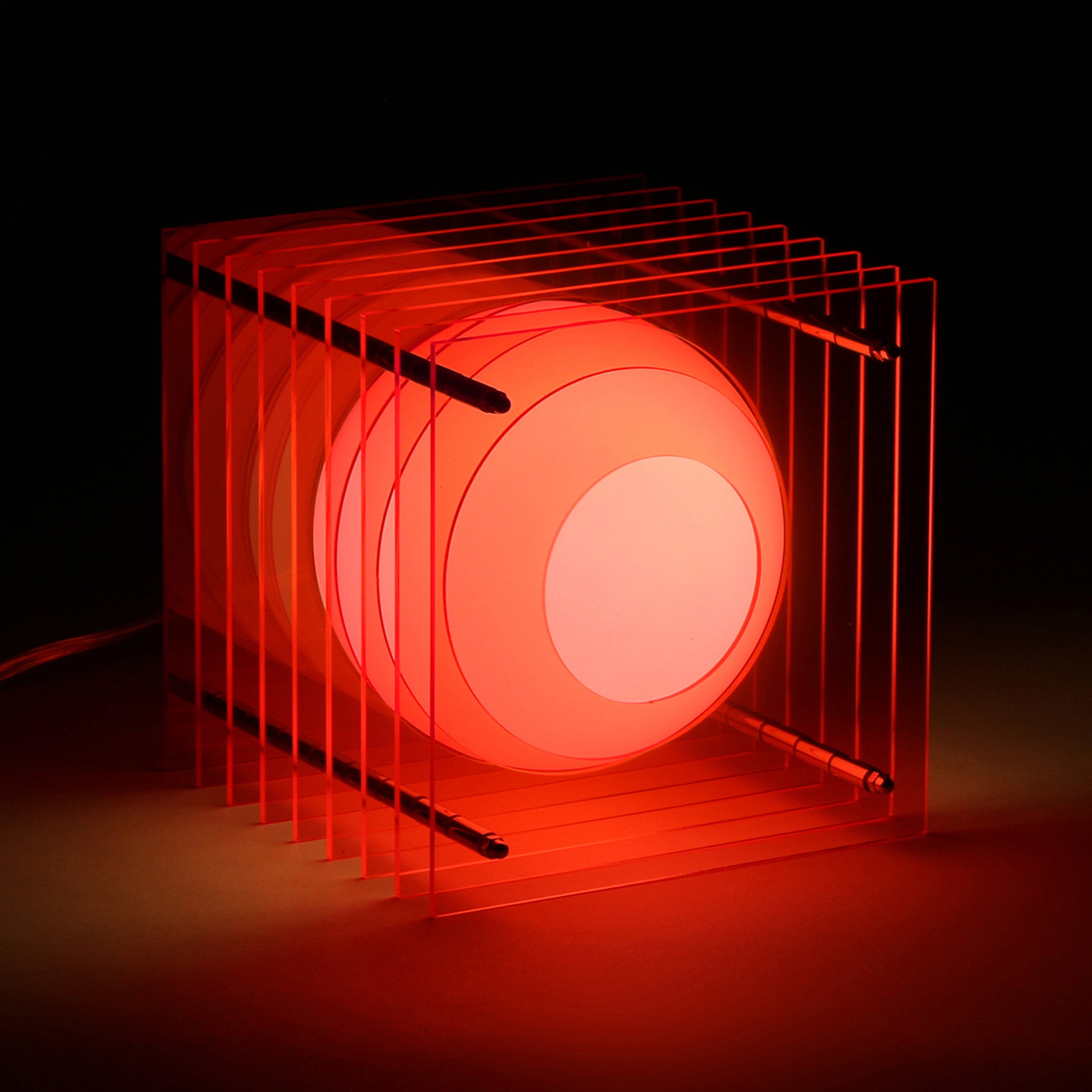 Mesmerizing and futuristic. the Layers Table Lamp brings moody light and color into your space. Composed of nine acrylic sheets and a glass globe shade. the Layers Table Lamp was conceived by Thomas Vincent. creative director and designer for the Vietnam-based brand BằNG. The Layers Table Lamp measures 7h x 7w x 7.7d. Powered by standard plug-in. Requires one E26 G45 LED bulb (included).