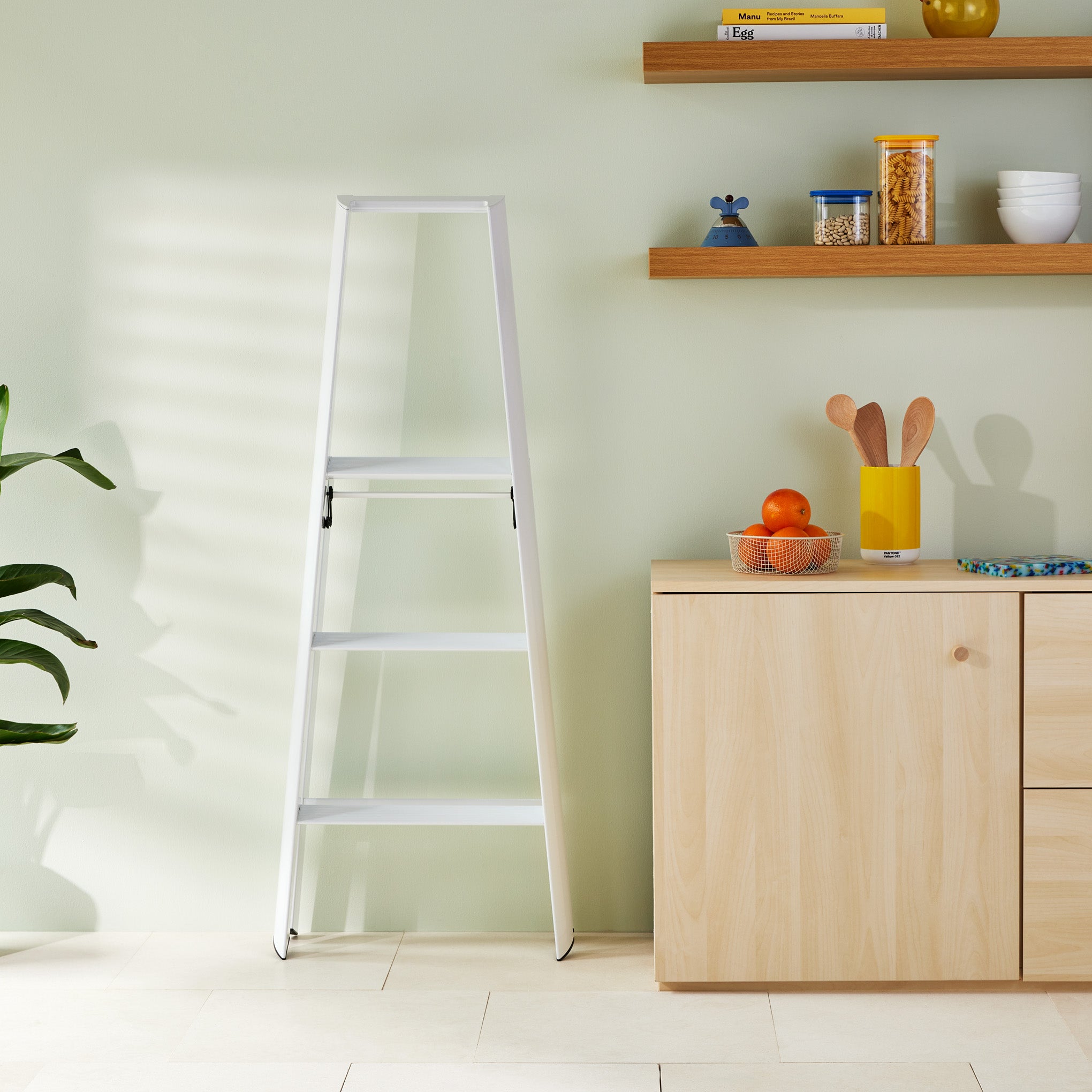 A stool that combines elegance and ease. the Lucano closes in one motion and is freestanding when closed. With invisible screws and simple aluminum and steel construction. you’ll never want to stow this stool. Use the stool around your home for everyday tasks. from making repairs and changing light bulbs. to putting away dishes and reaching books on high shelves. The Lucano Step Stool is made in Japan by a manufacturer that has been producing high-quality ladders and scaffolding since 1956.  Maximum supporting weight is 220lbs.