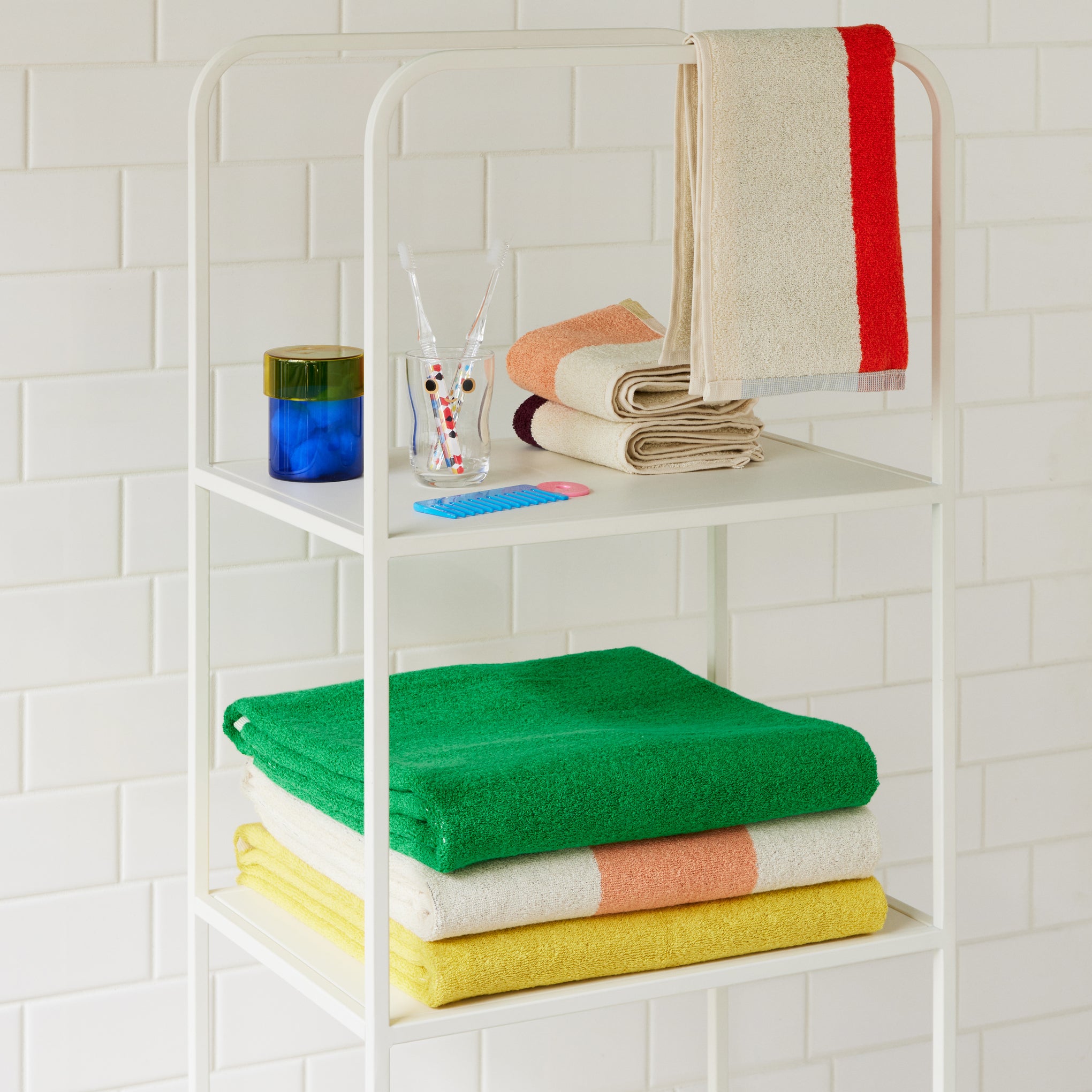 A collaboration with artist Karl Martens. the hues for this towel are derived from Martens’ project Colours on the Beach. Made in Portugal from 100% organic cotton. this towel features vivid blocks of contrast color on each side—a great way to add an upbeat pop of color to your bathroom. Machine wash cold. tumble dry low.