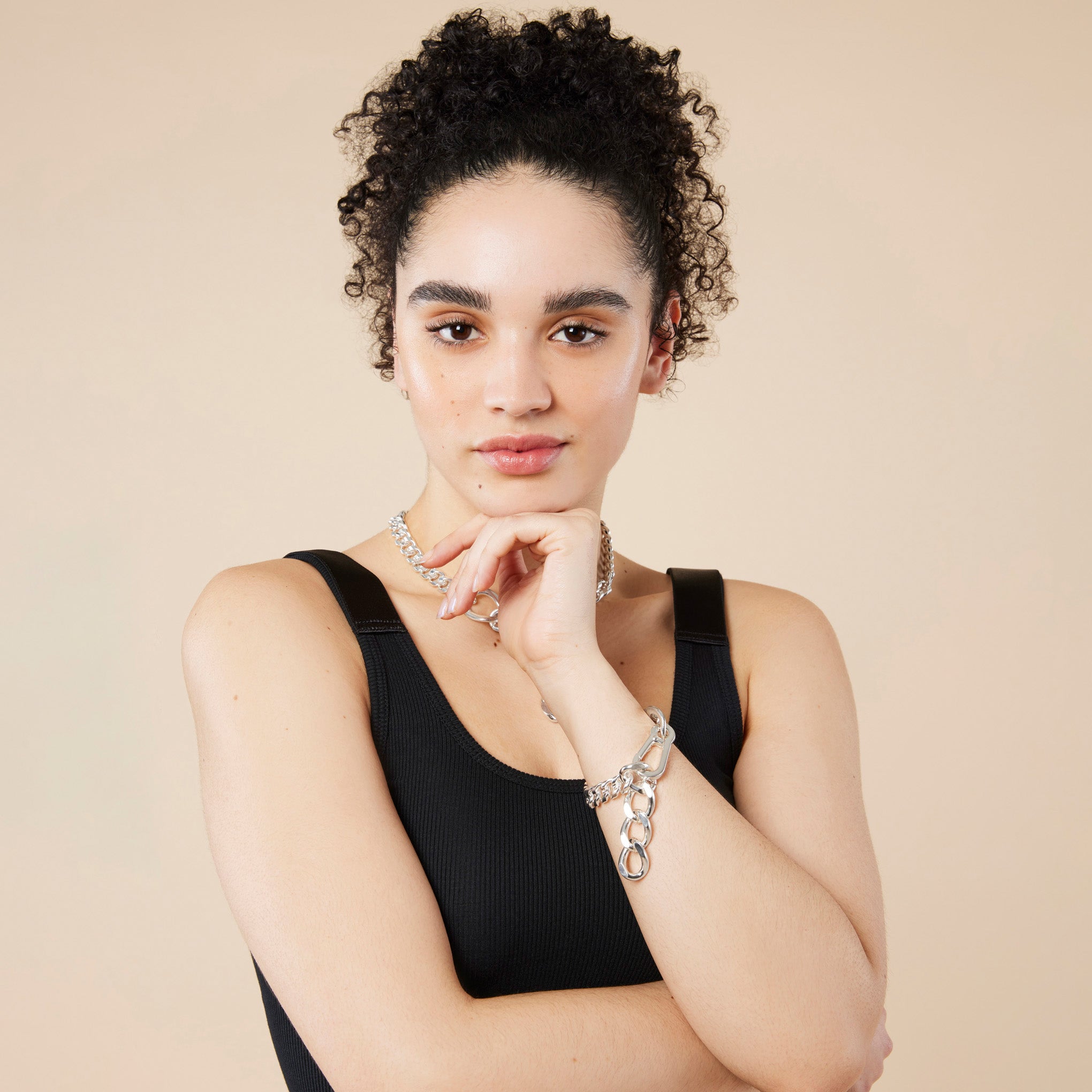 MoMA Exclusive: Martine Ali is a Chicago-born. Bushwick-based designer of color who is known for unisex jewelry inspired by the New York City utility. ’90s grunge and hip-hop culture. Her pieces are designed with the intention of modular versatility. suggesting each one be as unique as its wearer. This Luc Curb Bracelet features a chunky chain that will add impact to both everyday outfits and statement looks. It has a lobster claw clasp and oversized links which allow you to easily adjust the length.? Wear yours with the matching necklace for extra impact. Crafted in the designer’s signature heirloom silver. a sterling silver-coated brass that has been individually dipped. polished and sealed by a team member of the Brooklyn studio. The Martine Ali Silver Luc Curb Bracelet measures 10l.