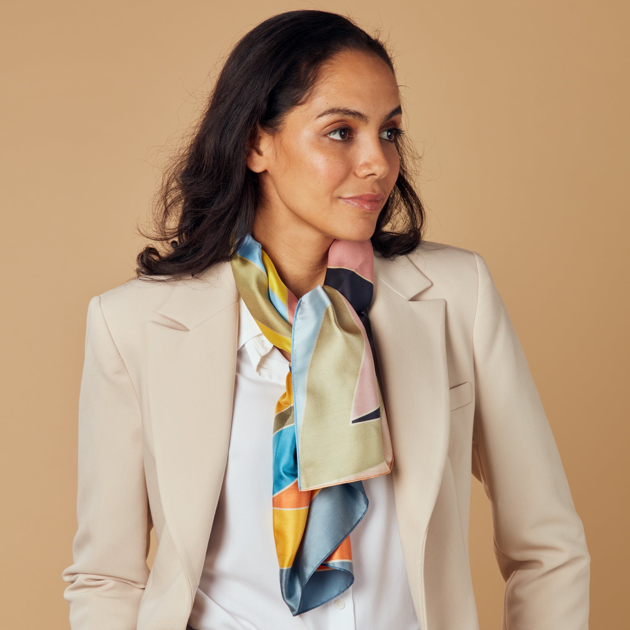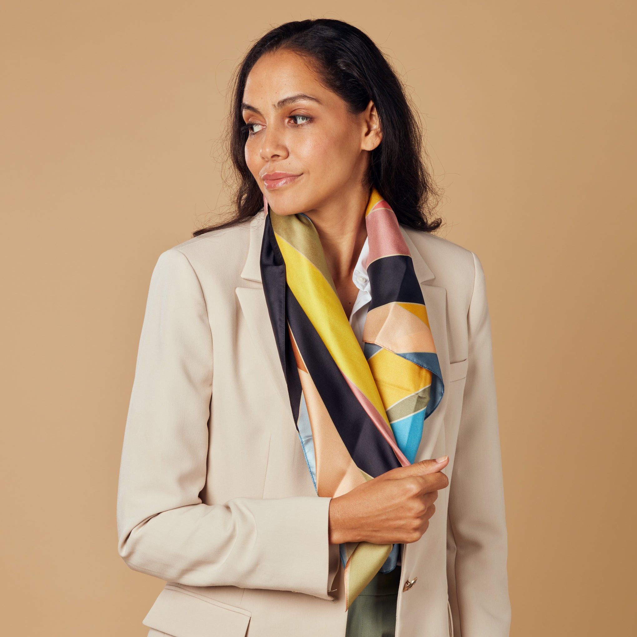 This 100% silk scarf features a reproduction of Frank Stella’s Abra Variation I (1969). a painting in MoMA’s collection. Dry clean only.