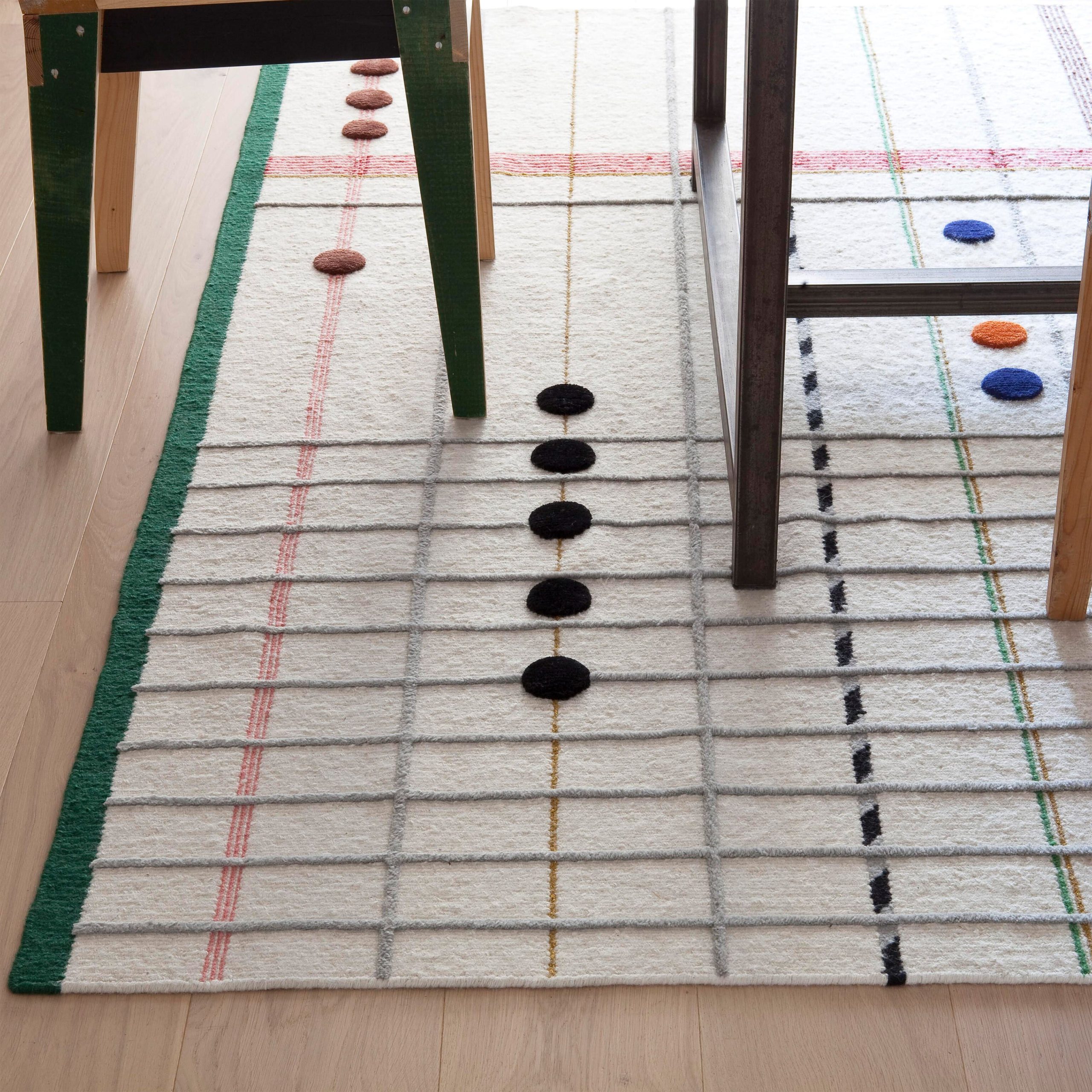 This hand-knotted and hand-woven rug by Doshi Levien is distinguished by a refined combination of a patterns and a unique graphic sensibility. The designers were inspired by the sensual and shiny world of Indian tribal folk embroidery. Made in India from New Zealand wool. Doshi Levien are represented in MoMA’s collection. All rugs are handcrafted so they may differ slightly in size and color and should avoid prolonged exposure to direct sunlight.