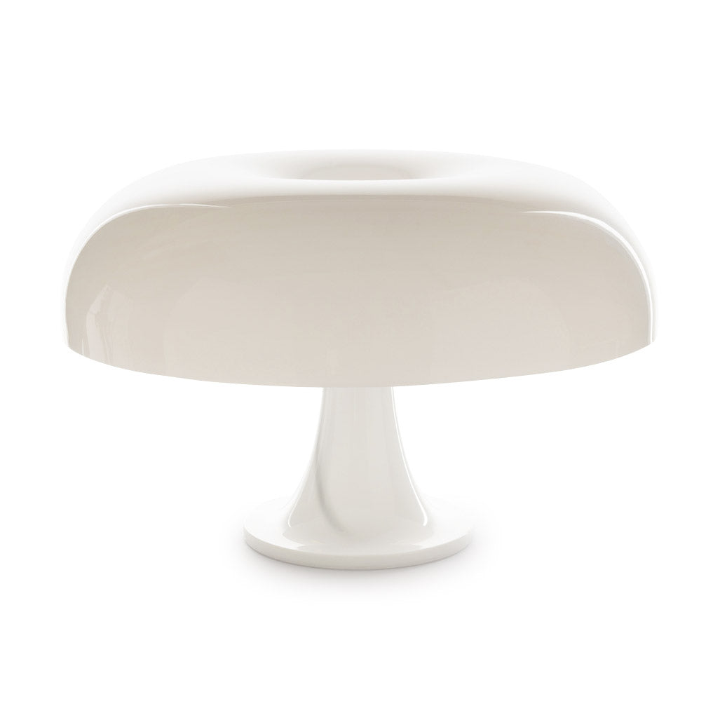 In 1965. Italian designer Giancarlo Mattioli. guided by the era’s enthusiasm for space-age forms and materials. experimented with then-newly-available thermoplastic resins. The result was this Nesso Table Lamp. an object represented in MoMA’s collection. Invoking an otherworldly mushroom. the Nesso Lamp’s eye-catching shape provides diffused incandescent light. Produced by Artemide. the Nesso Table Lamp has an on/off switch on its 48l cord and requires four 25W candelabra base incandescent bulbs (not included). The Nesso measures 13.5h x 21.25diam.. with a 8.25d base.