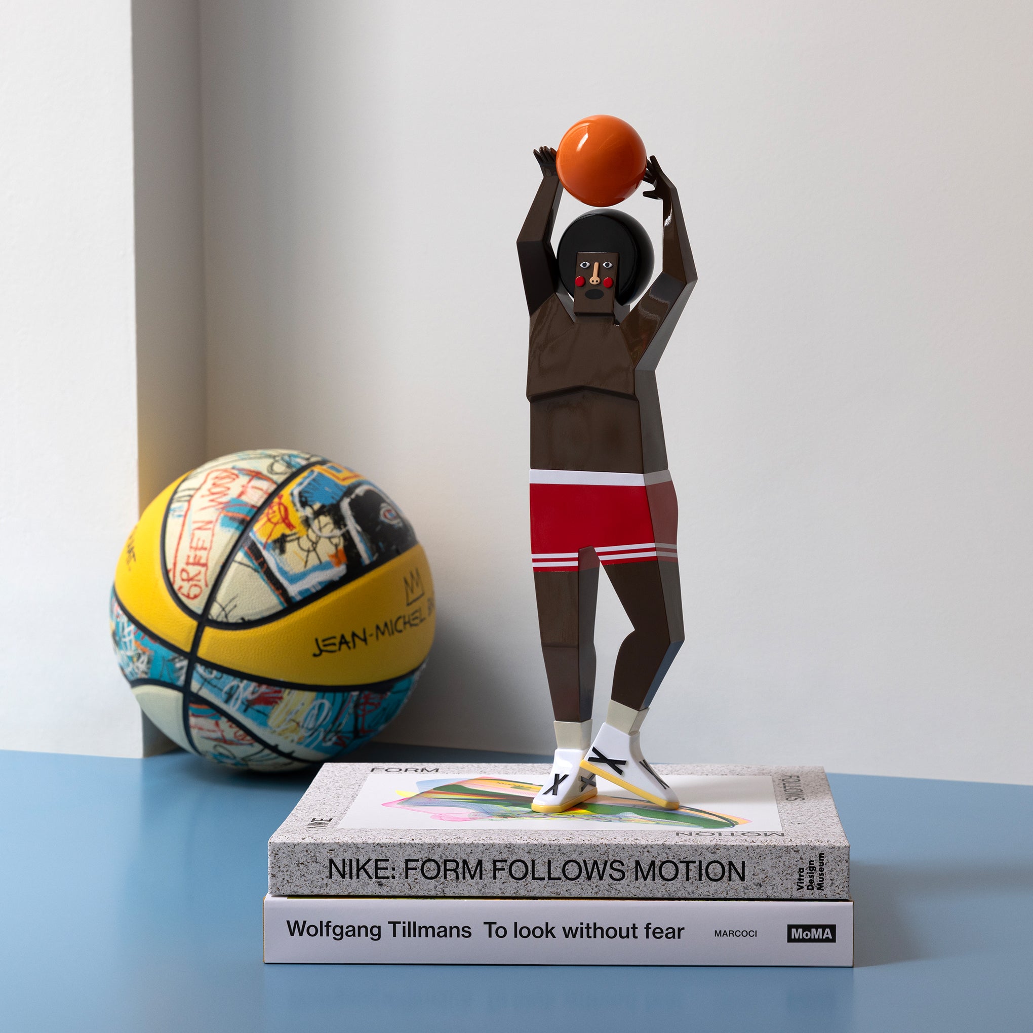 Inspired by classic Starting Lineup figures. this Bravo toy figurine—designed by Nina Chanel Abney. an artist with work in MoMA’s collection—celebrates the everyday icon. the local star. the hero at home. Sculpted in Abney’s bold. cubist-influenced style. Bravo captures a familiar figure in motion. mid-jump shot. with a bright orange basketball held high.