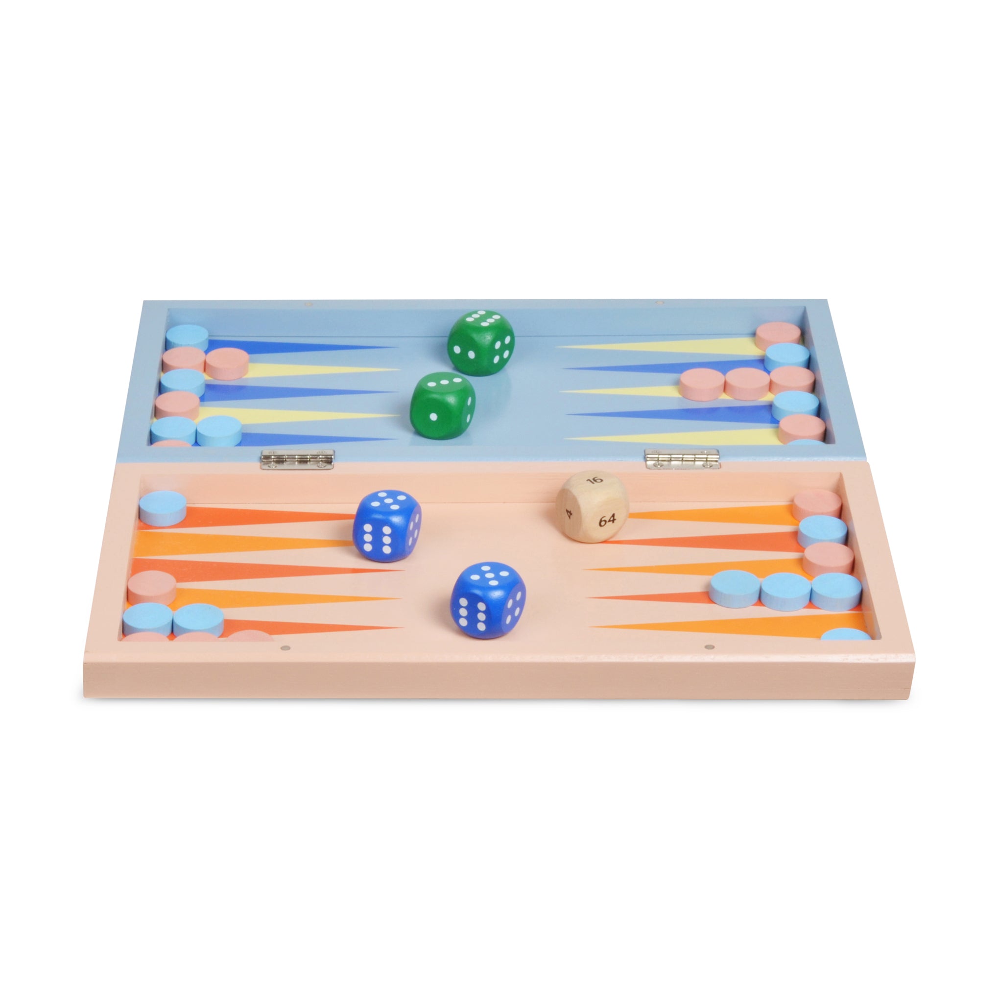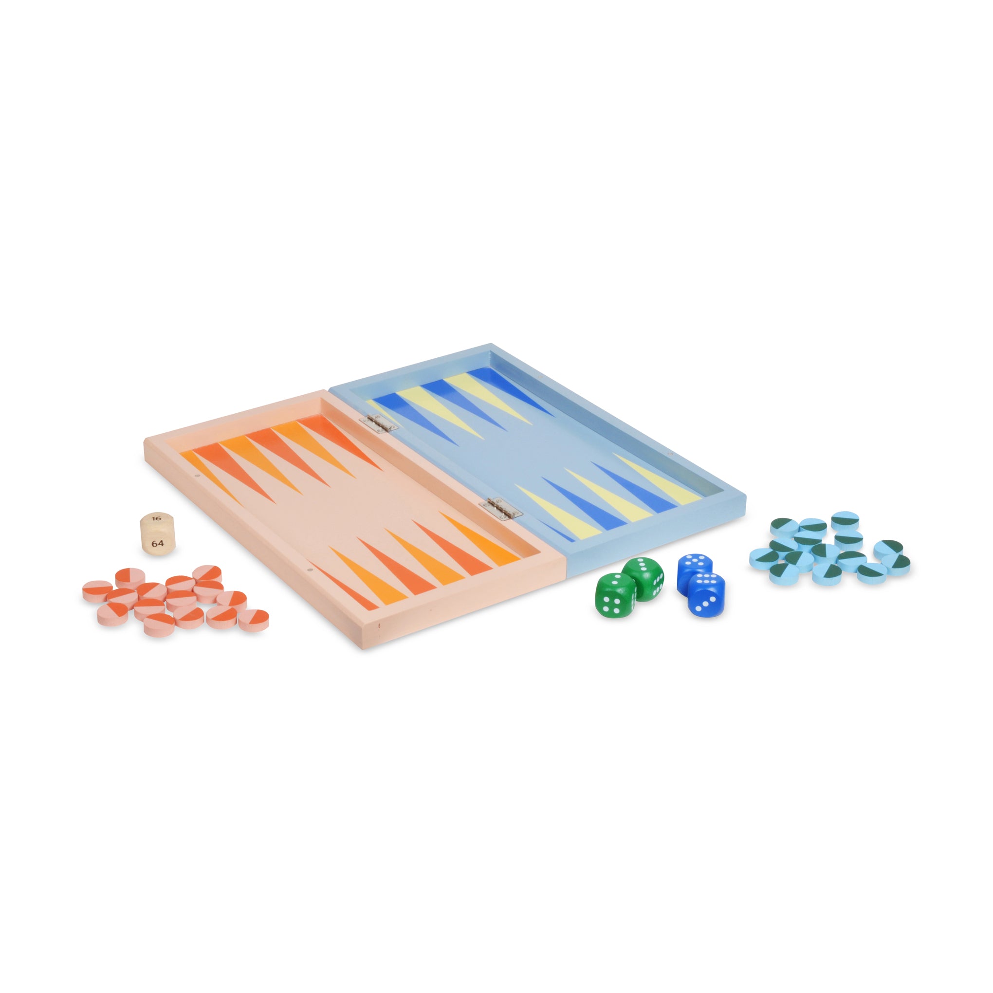From toys and games designer Panisa Khunprasert. who learned her craft in her family business in Thailand. comes this fresh take on the classic game of backgammon. The board. dice and playing pieces are rendered in unconventional colors??bright pastels. vibrant orange and red??creating a game set you’ll want to leave on display. open or closed. when you’re done playing. The board folds up for easy storage of the dice and pieces. The Panisa Backgammon Set is made from rubberwood and measures 2h x 15.75w x 8d when closed and 1h x 15.75w x 16d when open. Recommended for ages 5+.