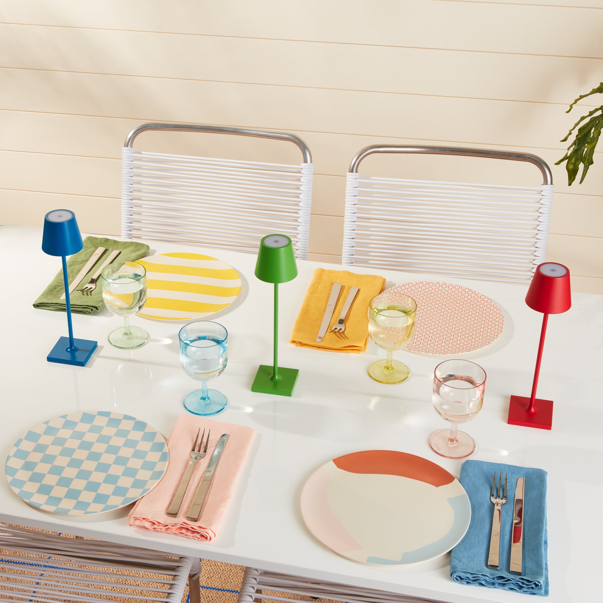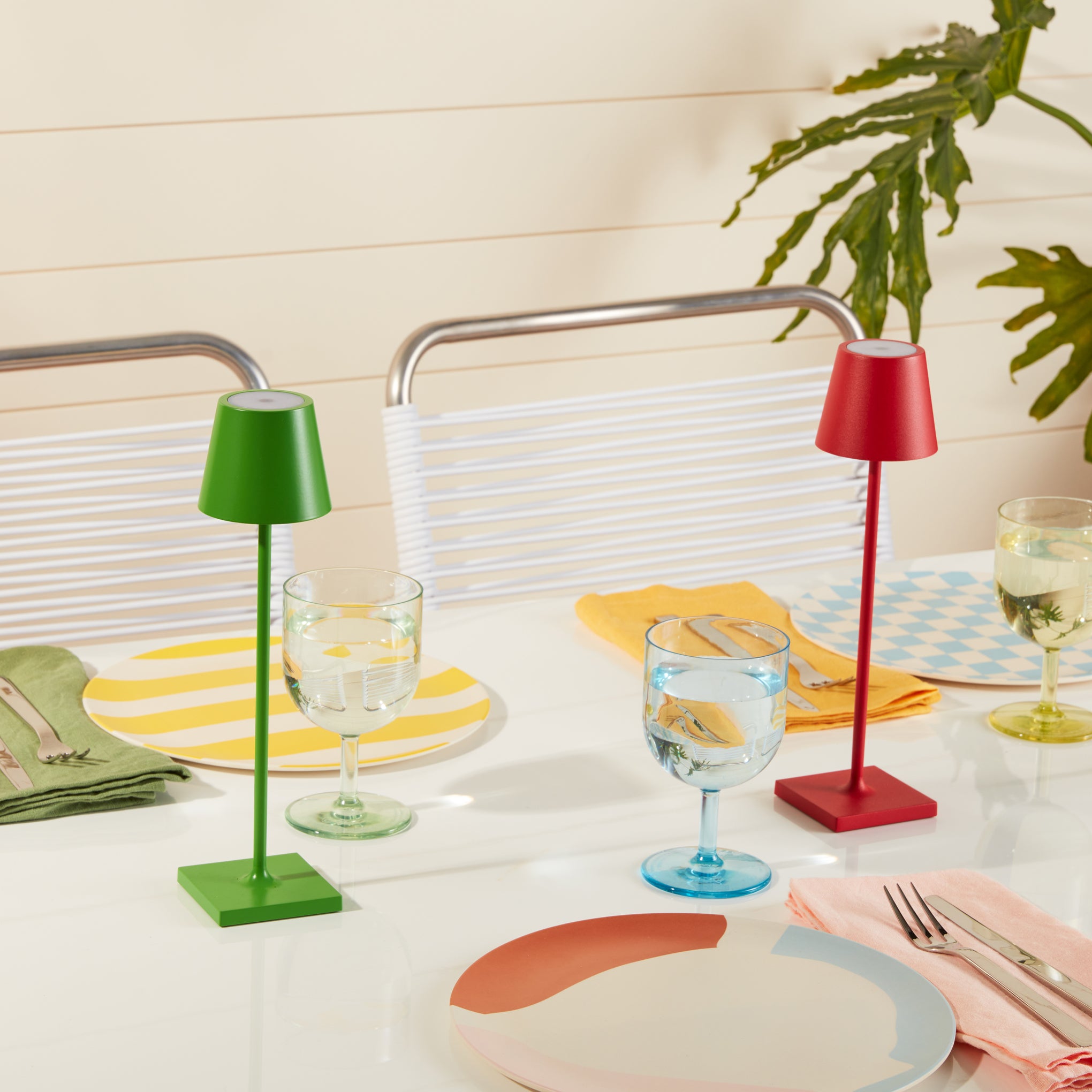 Small. chic and endlessly portable. the Poldina is a rechargeable design with a colorfully painted aluminum body. It provides mood light wherever you need it with a polycarbonate diffuser and LED light source. The Poldina is switched on and off with a touch button on top of the diffuser. The button can also be used as a dimmer and also to adjust the light’s color temperature from warm to cool. Its IP65 protection allows you to use it outdoors as well as indoors. The Poldina Micro Portable Lamp charges via the included contact charging base which can be used with a USB outlet or standard outlet (adaptor not included) and provides up to eight hours of light per charge. It measures 10.8h x 2.8diam.