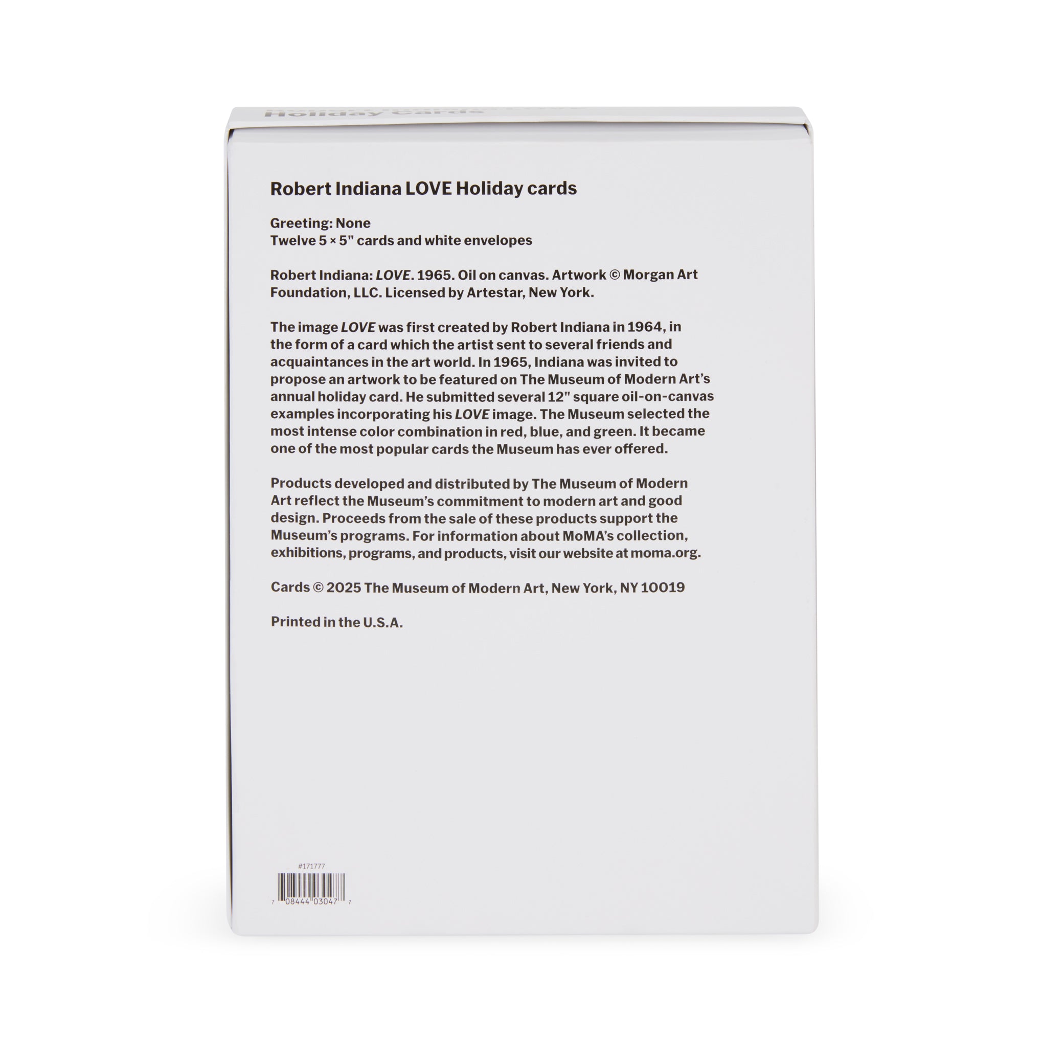 MoMA Exclusive: The image LOVE was first created by Robert Indiana in 1964. in the form of a card which the artist sent to several friends and acquaintances in the art world. In 1965. Indiana was invited to propose an artwork to be featured on The Museum of Modern Art’s annual holiday card. He submitted several 12 square oil-on-canvas examples incorporating his LOVE image. The Museum selected the most intense color combination in red. blue and green. It became one of the most popular cards the Museum has ever offered. This set of 12 blank note cards features a reproduction of the iconic artwork. White envelopes. Each card measures 5h x 5w.