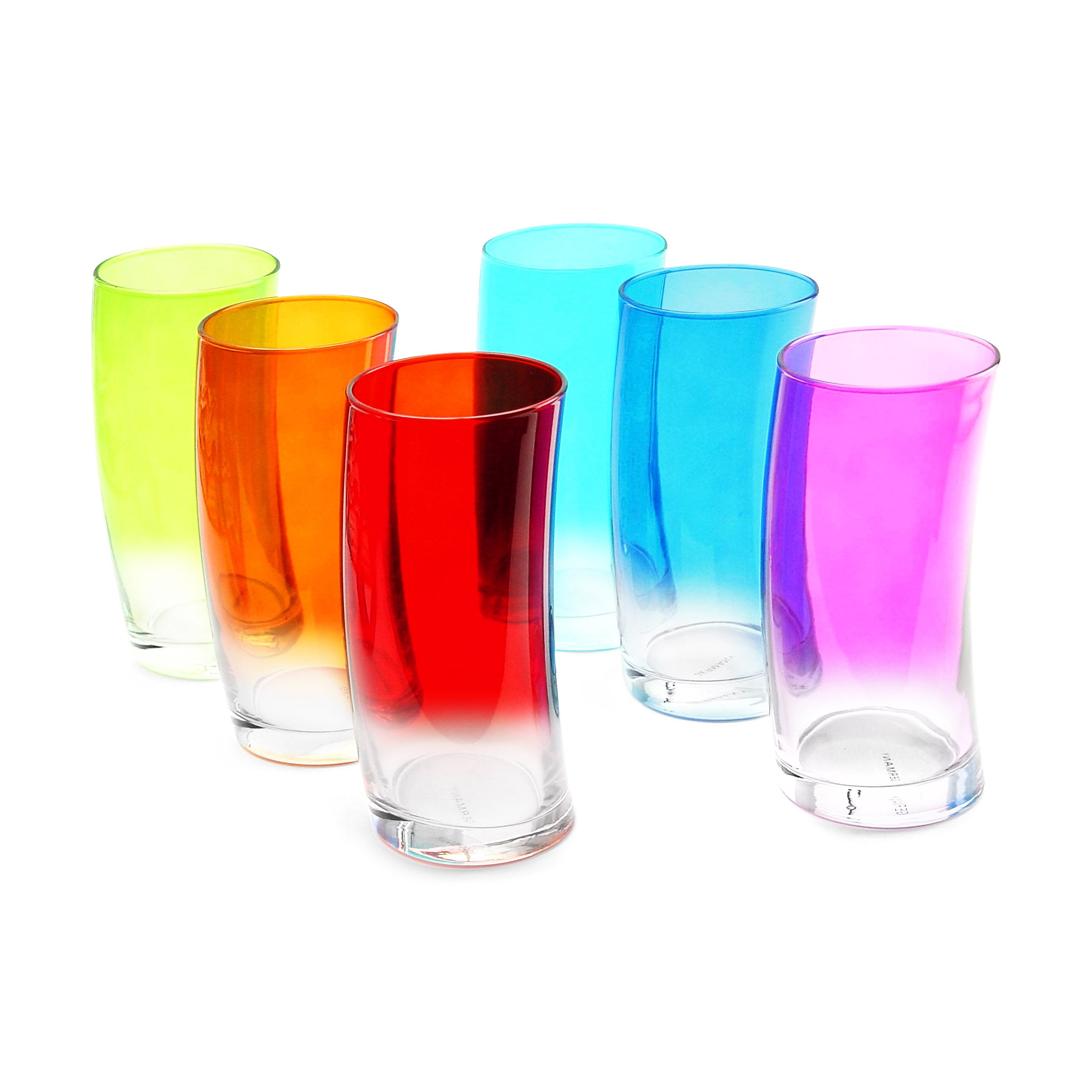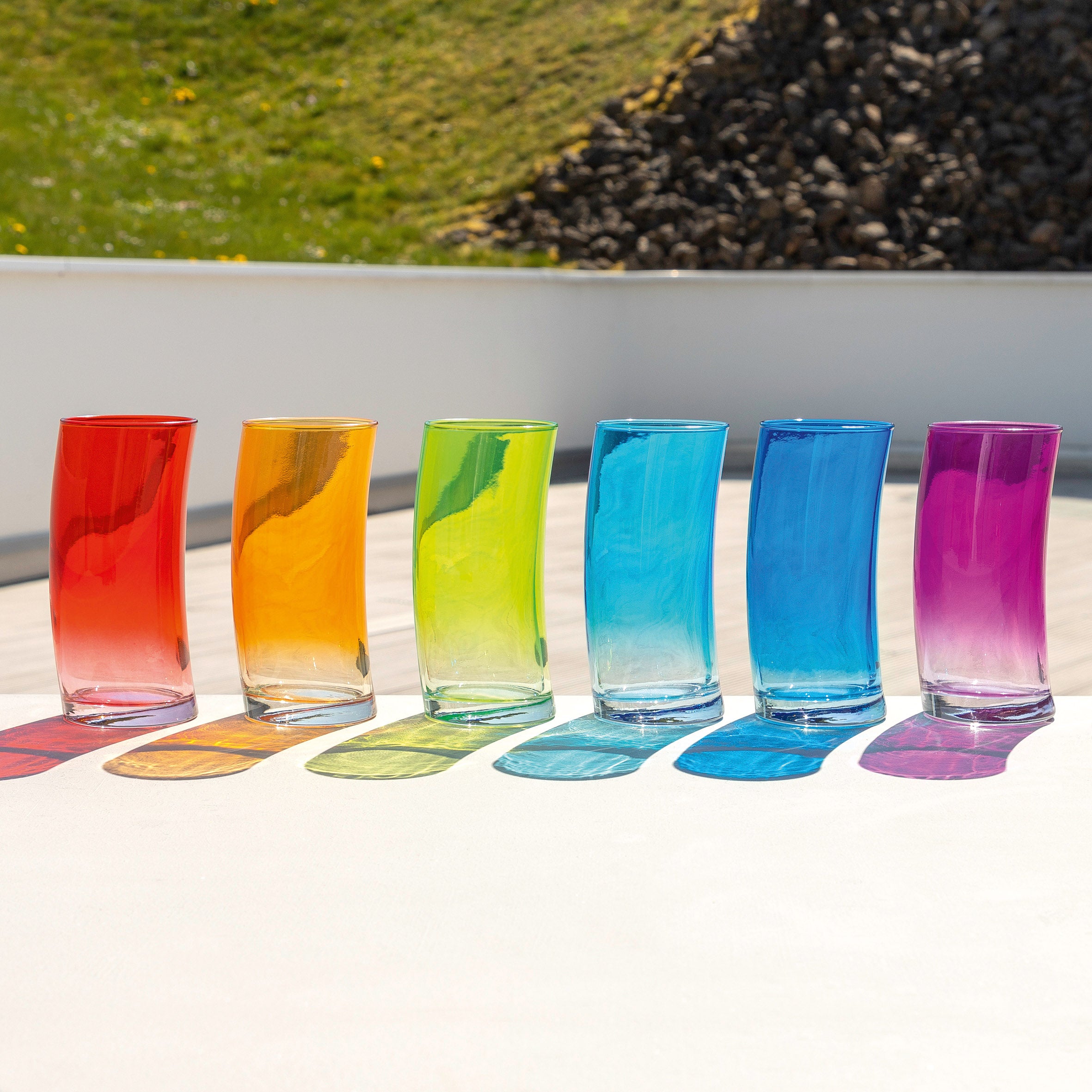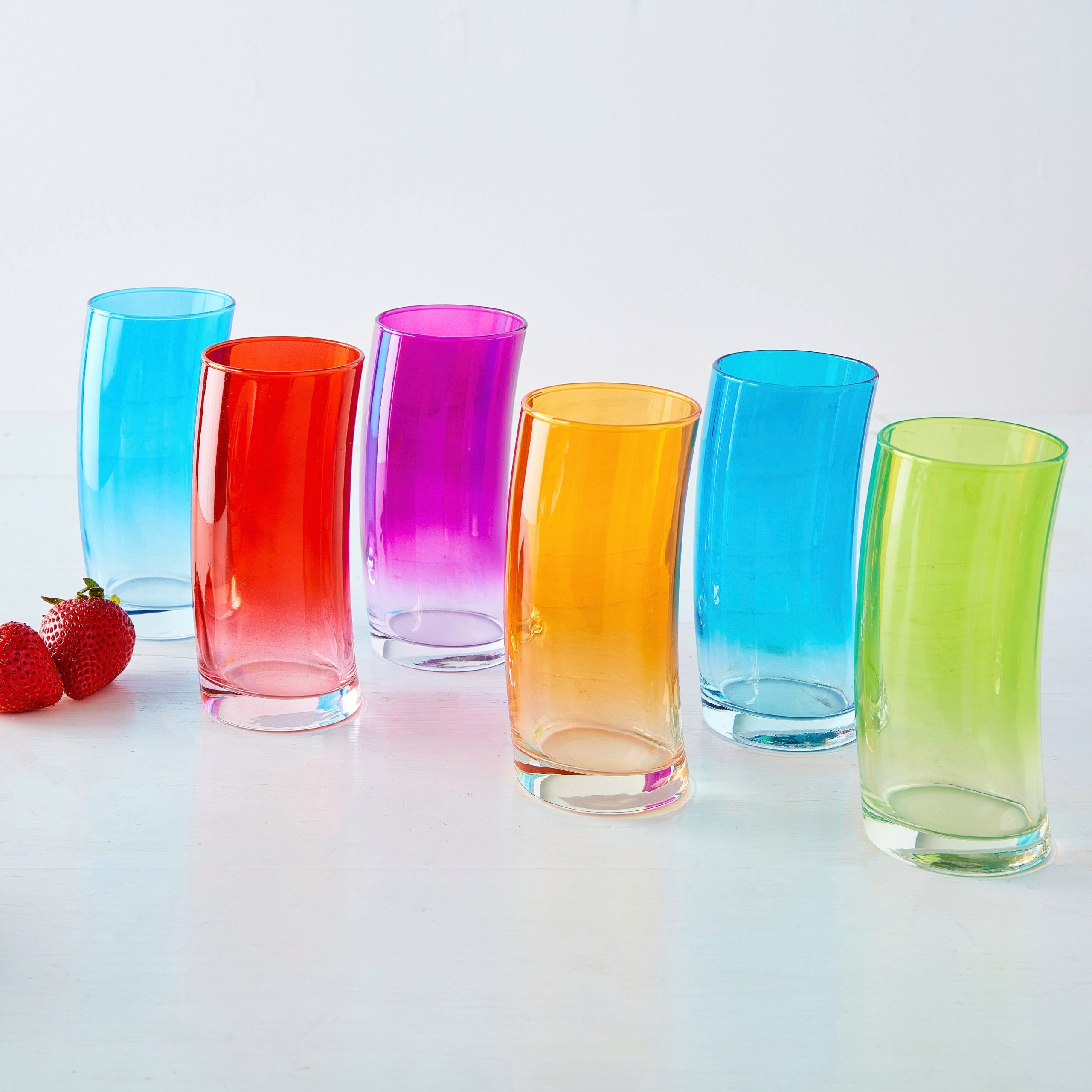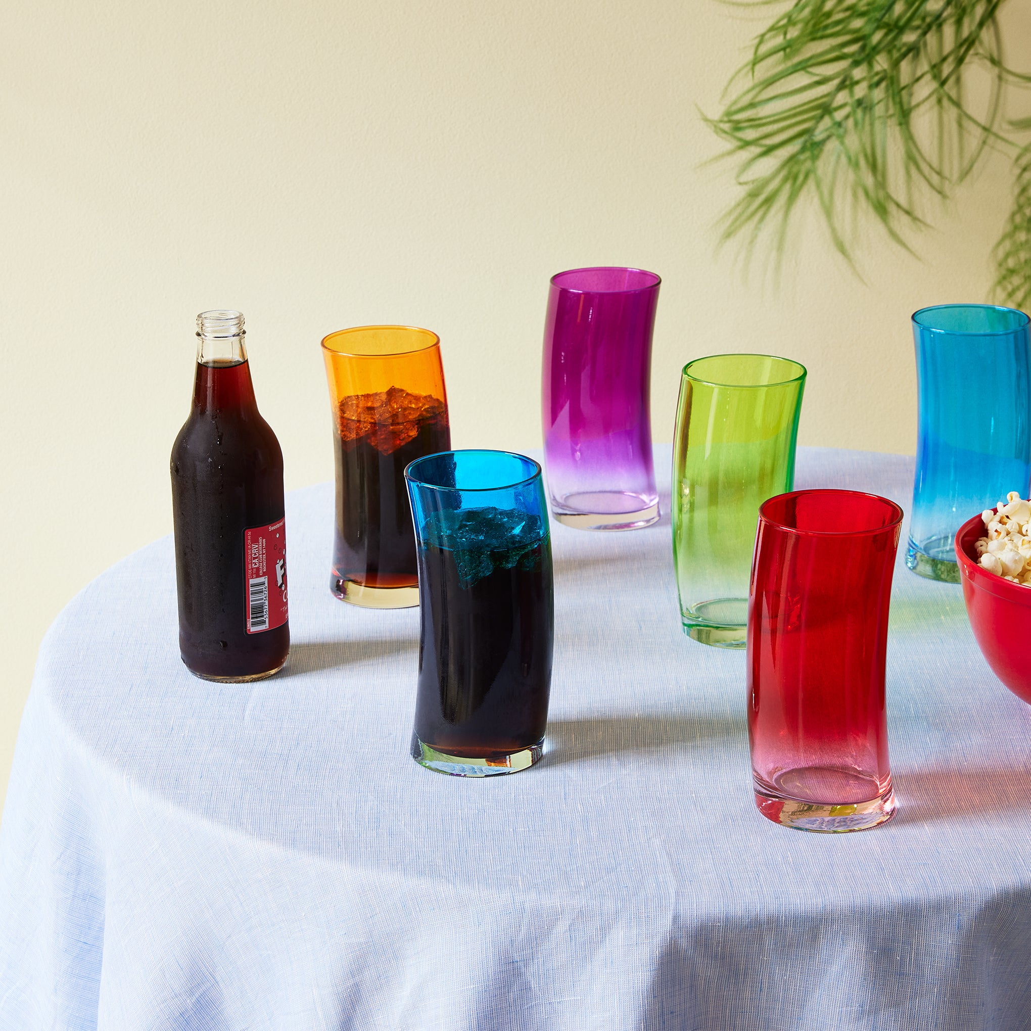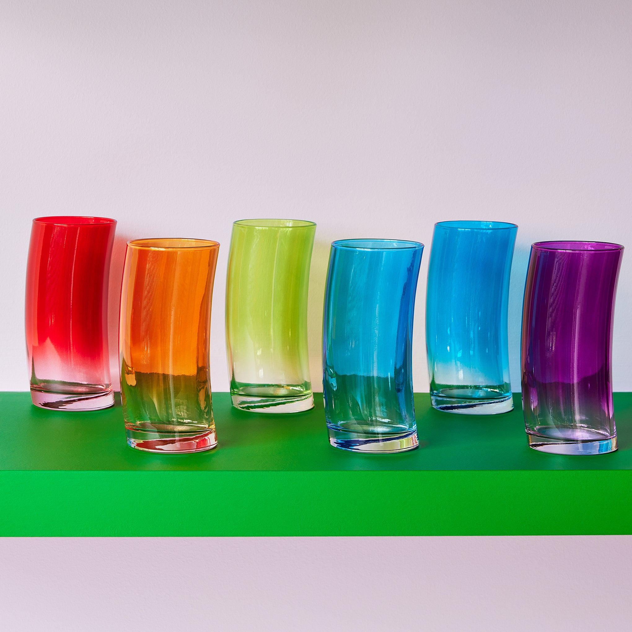 MoMA Exclusive: These blown-glass Swing Tumblers had a cult following at MoMA Design Store when they were sold in the early 2000s. After a years-long absence. these best sellers are back. to bring everyday whimsy and color to your home. This set of six includes the distinctive curved designs in purple. orange. red. blue. aqua and lime green. Hand wash recommended.