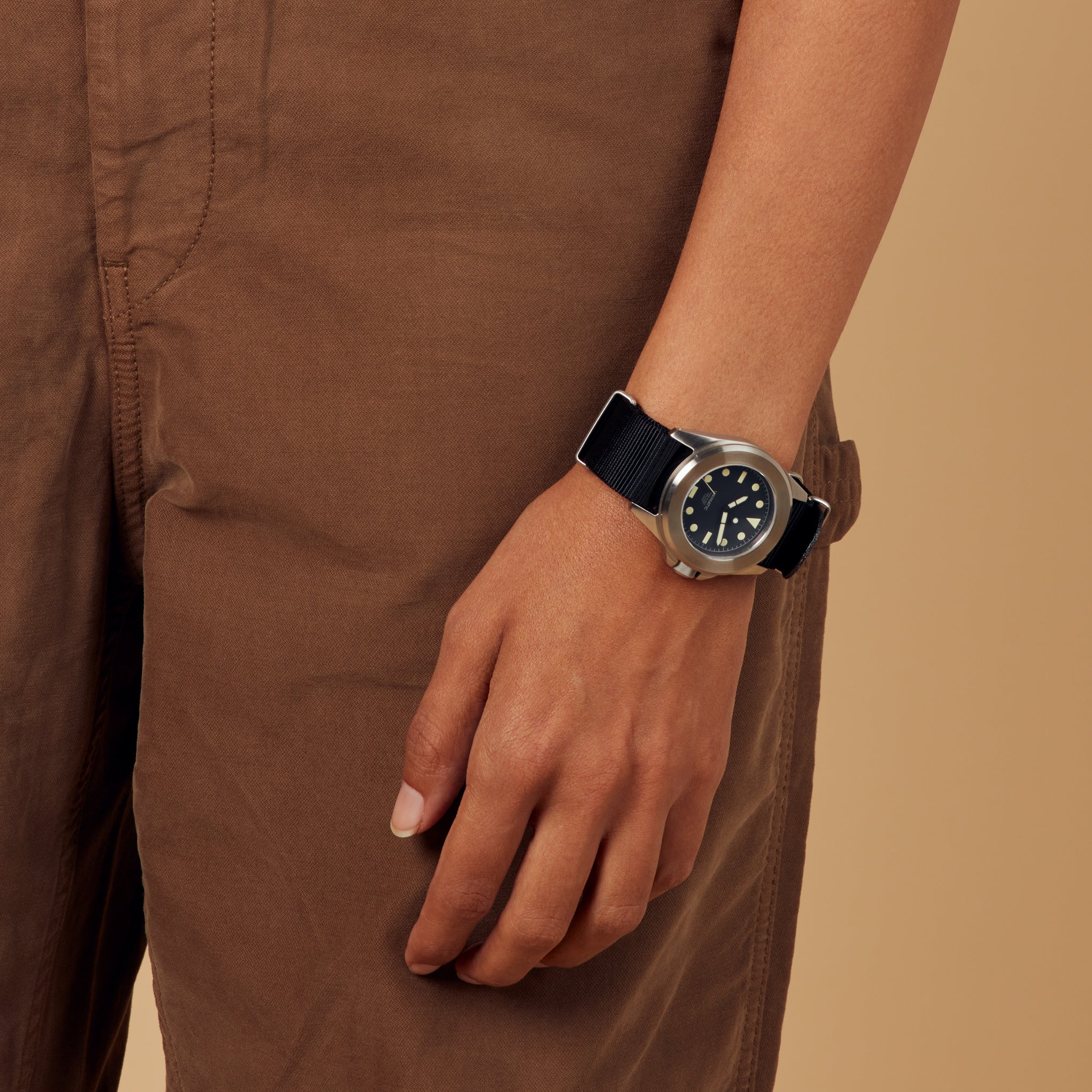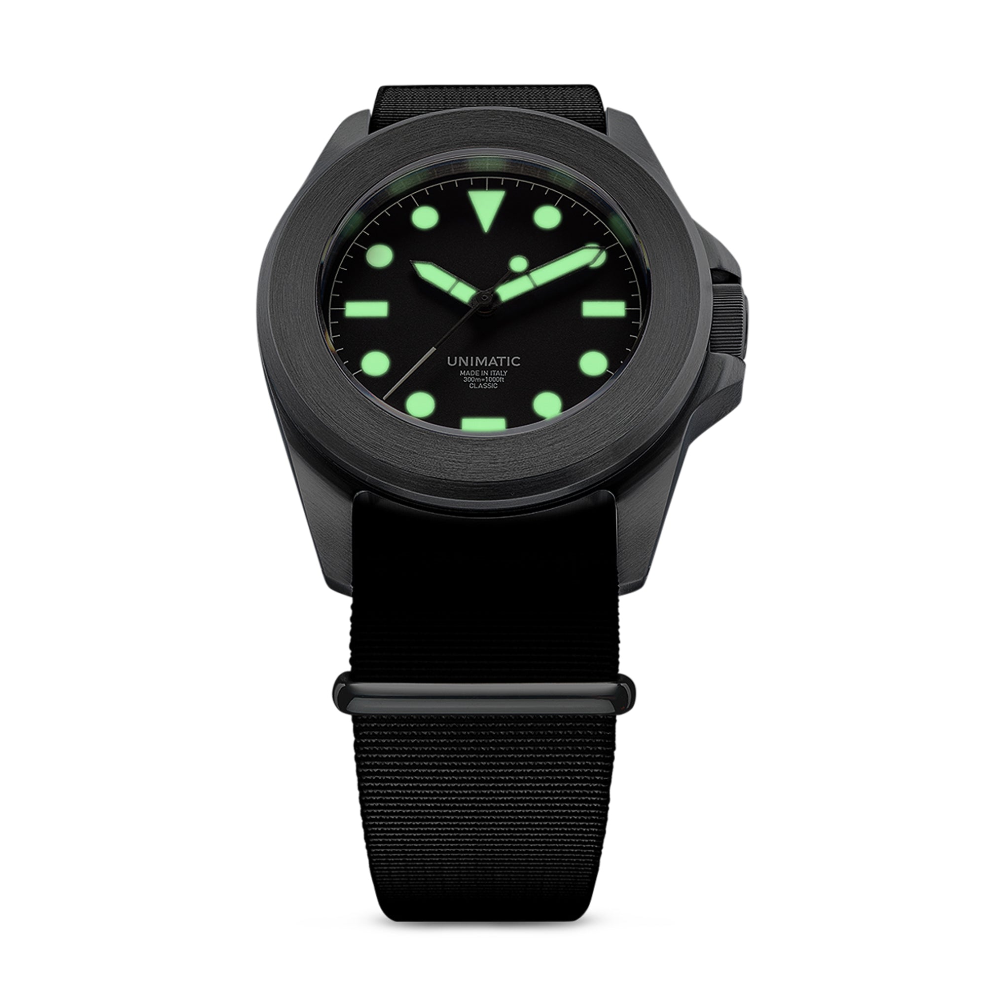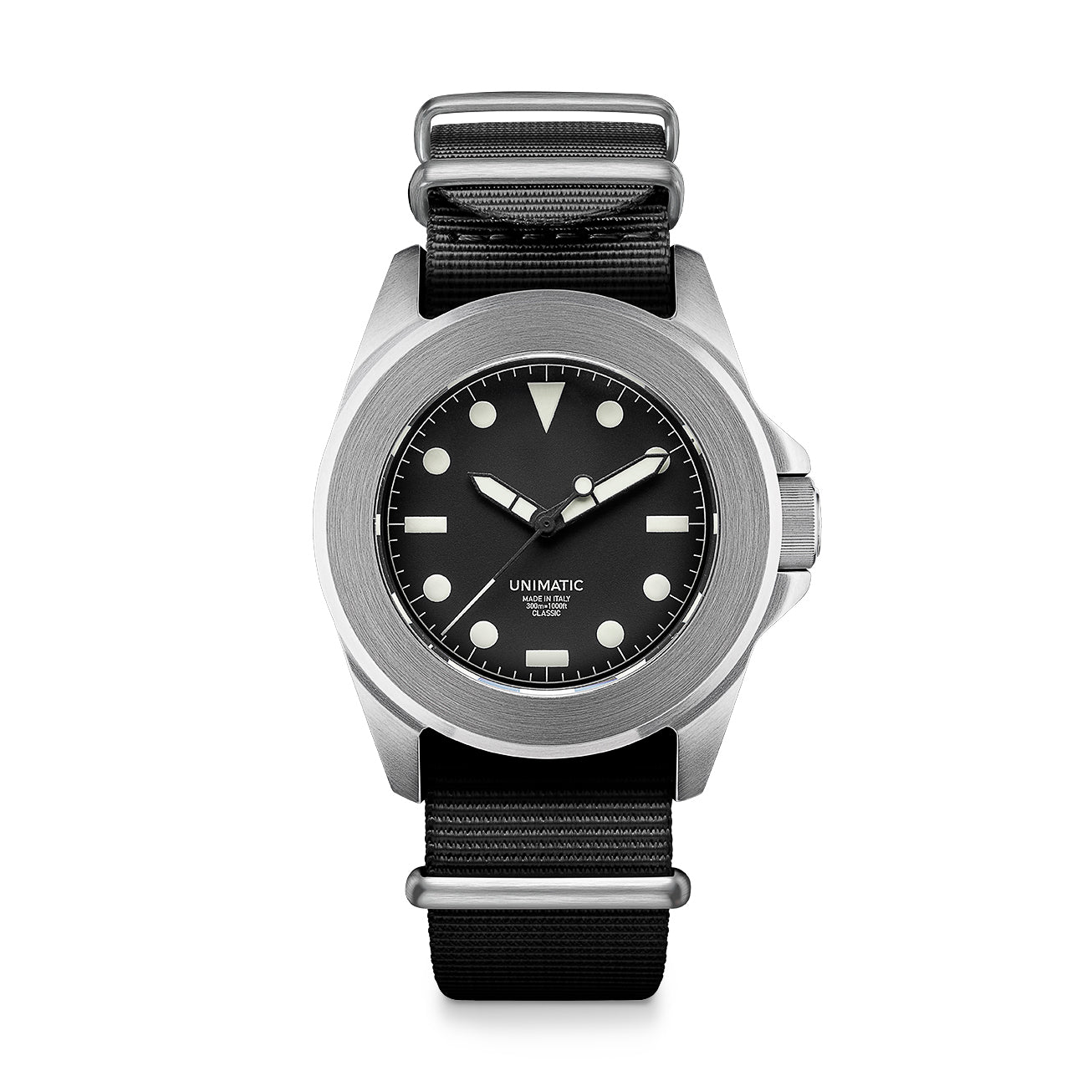 Founded by a pair of industrial designers in 2015. Unimatic produces diver. chronograph and field watches in Italy. This Modello Quattro Diving Watch has a military-inspired design that blends the Modello Uno Watch case into a bolder. tougher aesthetic. thanks to its Unimatic fixed bezel.