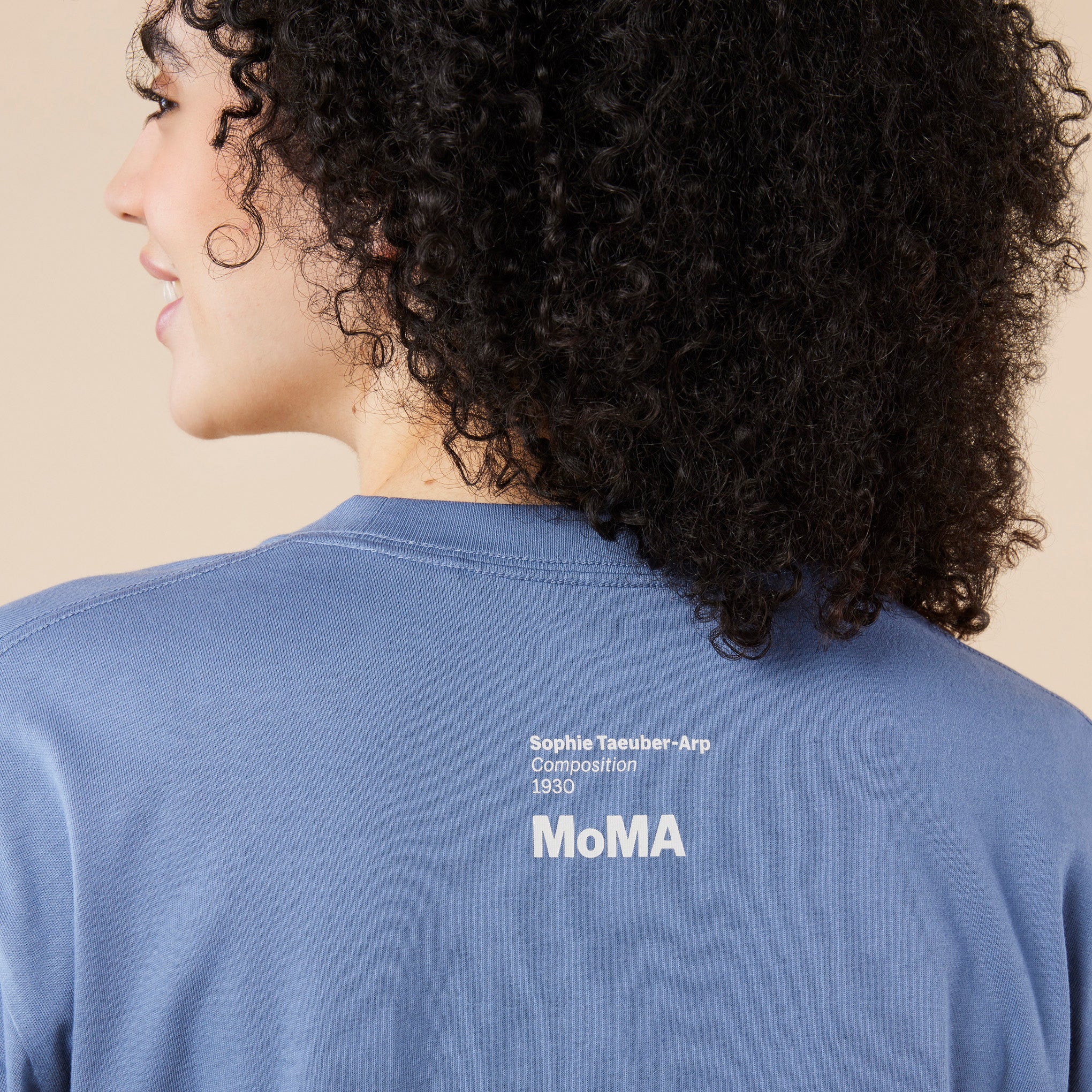 MoMA Exclusive: Due to popular demand. our Art Icons collaboration with UNIQLO is back with another series of designs. The collection features reproductions of iconic works from MoMA that have been reimagined for everyday wear. On the front of this cotton UNIQLO Sophie Taeuber-Arp T-Shirt is Composition (1930). a work of geometric abstraction painted with oil and metallic flakes. Taeuber-Arp will be featured in the exhibition Woven Histories: Textiles and Modern Abstraction. on view April 20 through September 13. 2025. The UNIQLO Sophie Taeuber-Arp T-Shirt is available in sizes S-XL.