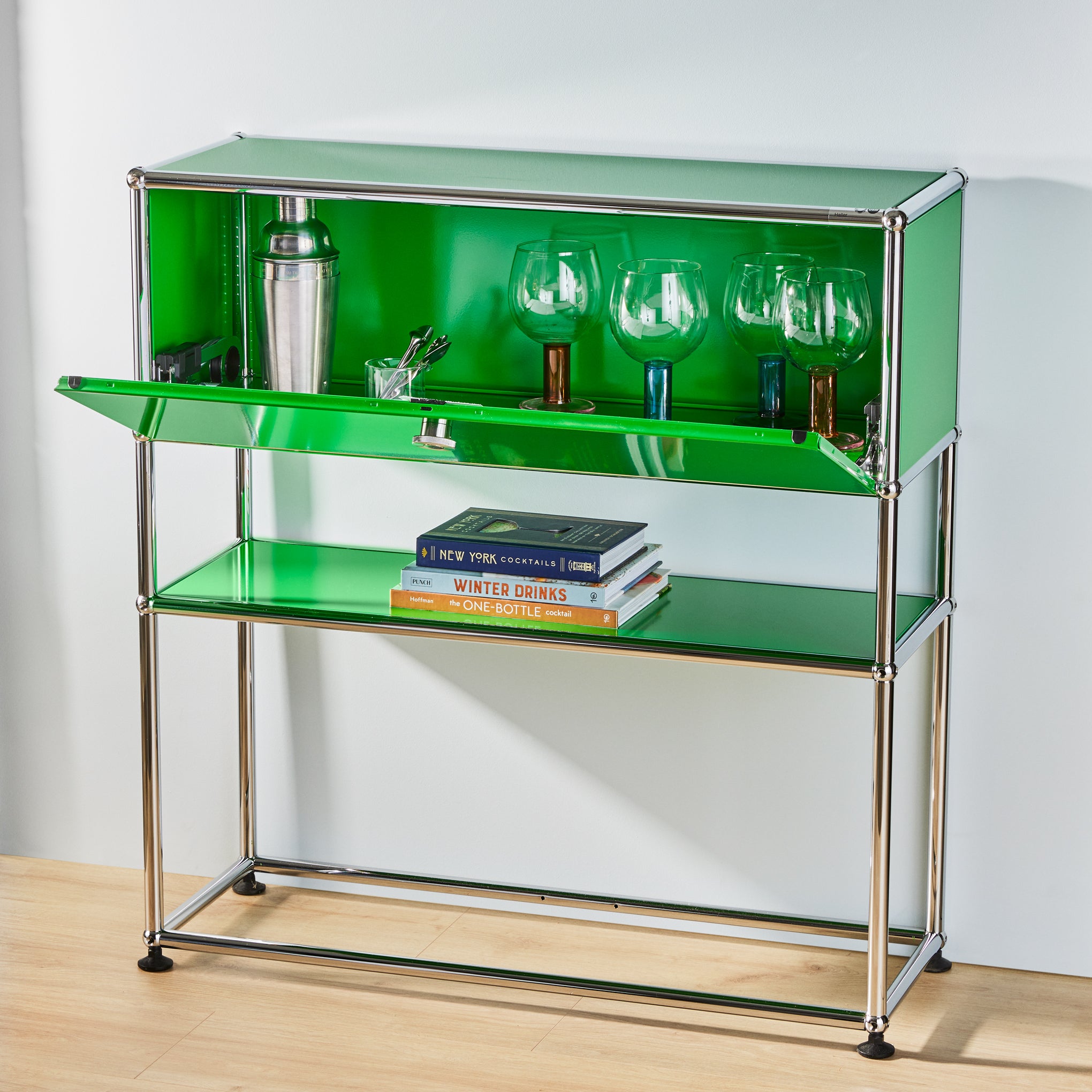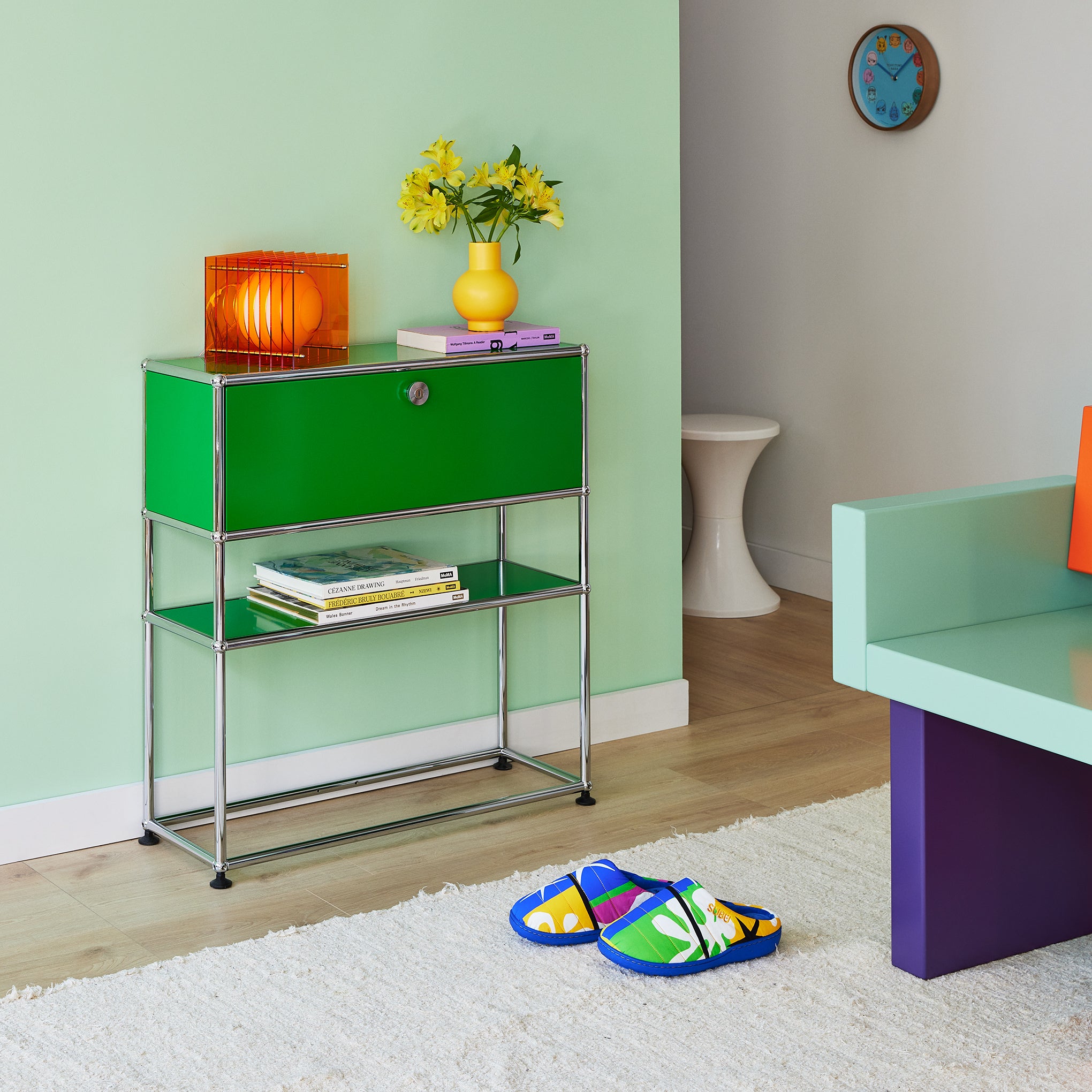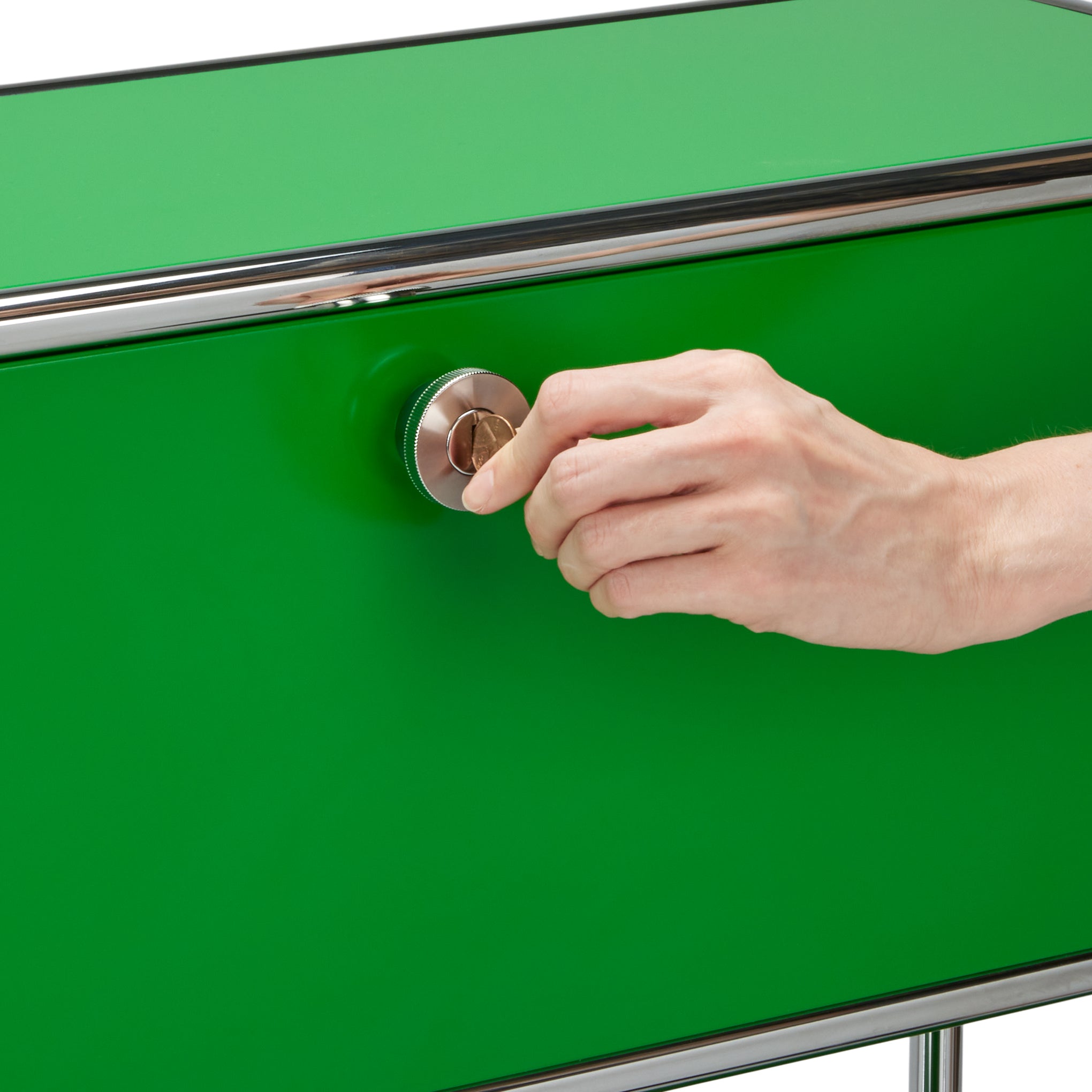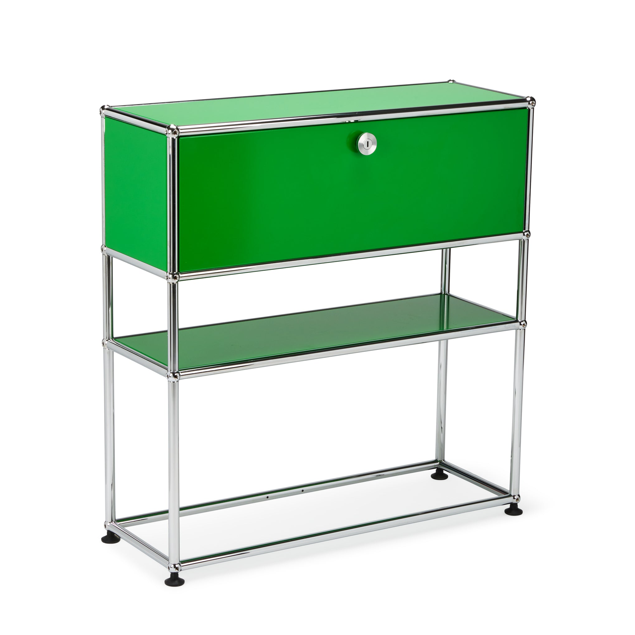 Sleek. chic and utilitarian. the USM Haller Console Side Table is a storage solution and show piece in one. Crafted with precision in Switzerland from bright green powder-coated steel panels. this console opens in the front to reveal a roomy space for storing various items. such as mail. keys. coins and accessories in your entryway. The cabinet door is lockable with any coin from your pocket. no key necessary. The top of the console and its lower shelf can be used for displaying books. plants and objets. It was designed by Paul Schaerer and Fritz Haller in 1964 for their modular furniture system. USM Haller. which has become an enduringly modern storage solution for homes and offices around the world. The Haller System is represented in MoMA’s collection. The USM Haller Console Side Table measures 32h x 30l x 11d.