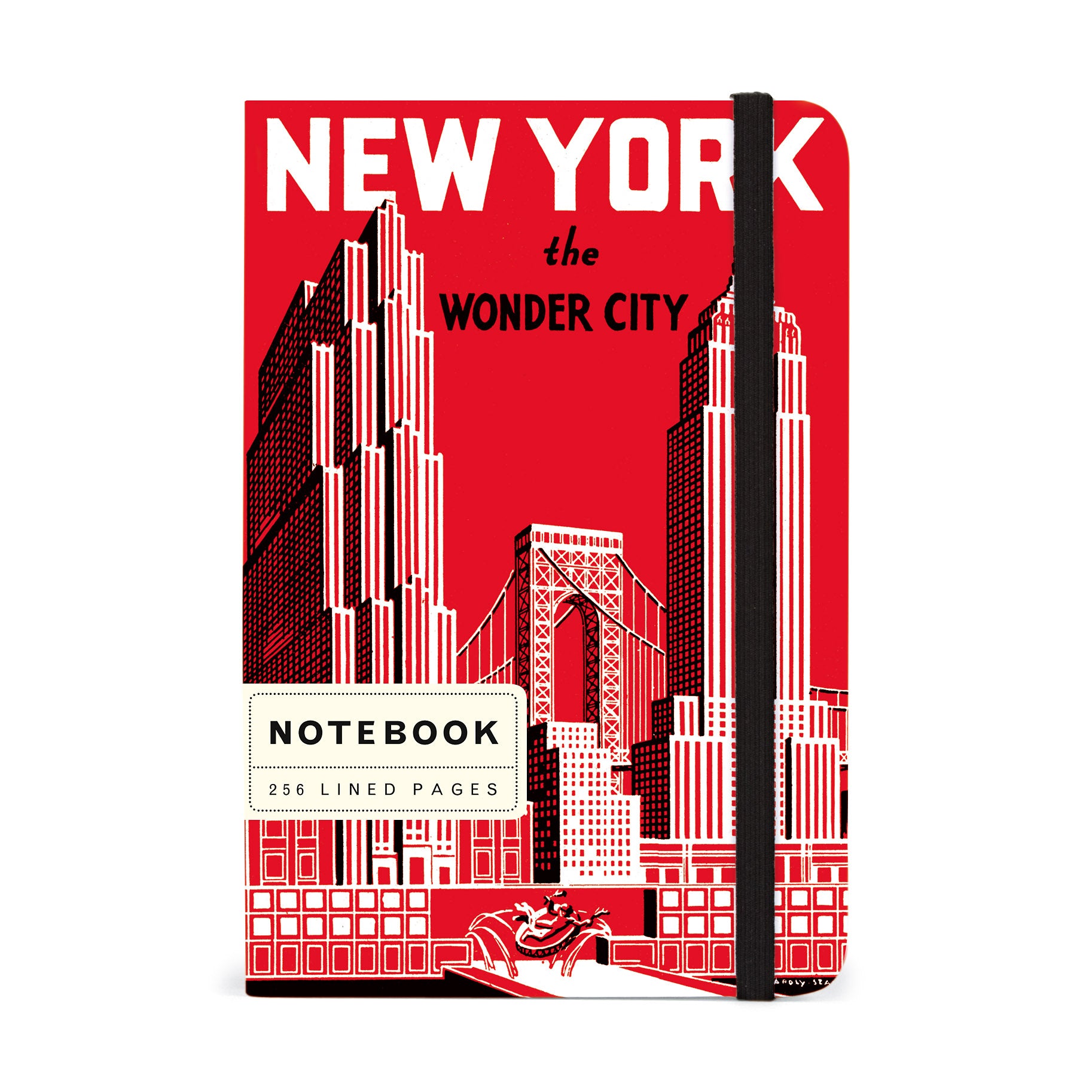 This 256-page black notebook features a cover printed with a vintage poster. New York the Wonder City. Bound with elastic to secure.